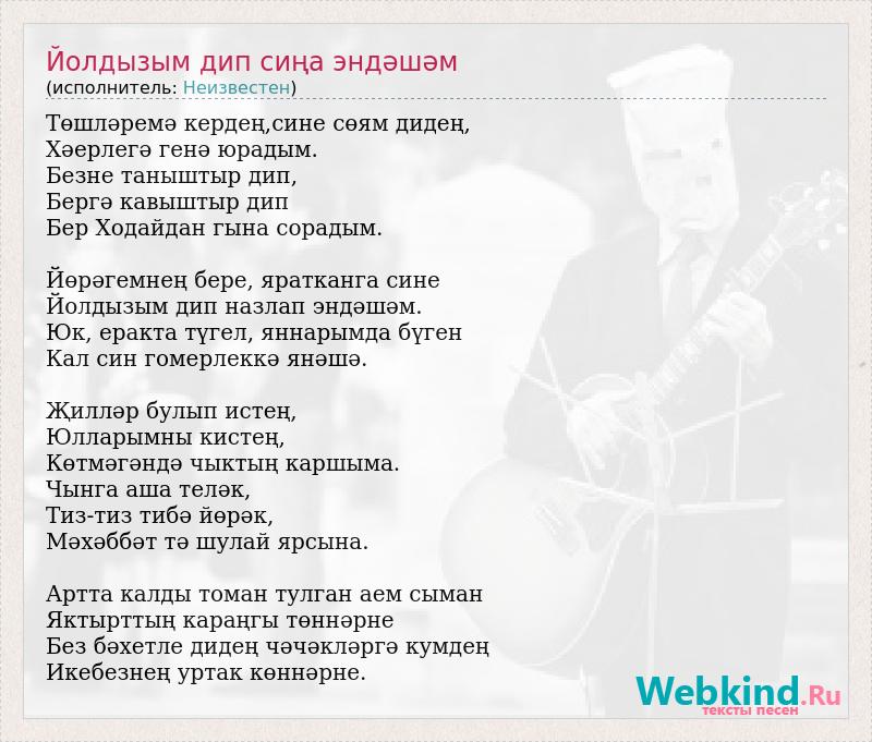Төшләремә кердең,сине сөям дидең, Хәерлегә генә юрадым. Безне таныштыр дип, Бергә кавыштыр дип Бер Ходайдан гына сорадым. Йөрәгемнең бере, яратканга сине Йолдызым дип назлап эндәшәм. Юк, еракта түгел, яннарымда бүген Кал син гомерлеккә янәшә. Җилләр булып истең, Юлларымны кистең, Көтмәгәндә чыктың каршыма. Чынга аша теләк, Тиз-тиз тибә йөрәк, Мәхәббәт тә шулай ярсына. Артта калды томан тулган аем сыман Яктырттың караңгы төннәрне Без бәхетле дидең чәчәкләргә кумдең Икебезнең уртак көннәрне.