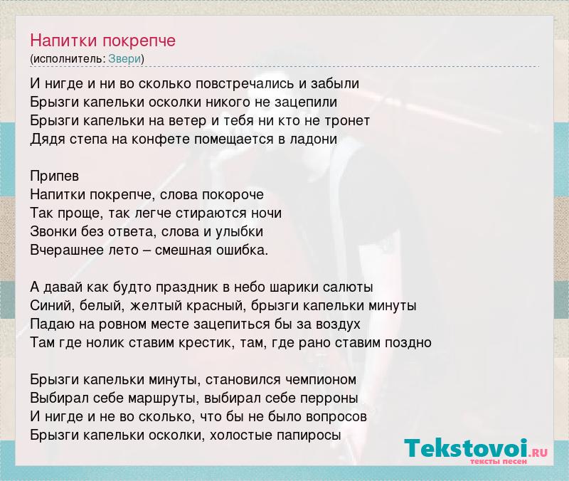 И нигде и ни во сколько повстречались и забыли Брызги капельки осколки никого не зацепили Брызги капельки на ветер и тебя ни кто не тронет Дядя степа на конфете помещается в ладони Припев Напитки покрепче, слова покороче Так проще, так легче стираются ночи Звонки без ответа, слова и улыбки Вчерашнее лето – смешная ошибка. А давай как будто праздник в небо шарики салюты Синий, белый, желтый красный, брызги капельки минуты Падаю на ровном месте зацепиться бы за воздух Там где нолик ставим крестик, там, где рано ставим поздно Брызги капельки минуты, становился чемпионом Выбирал себе маршруты, выбирал себе перроны И нигде и не во сколько, что бы не было вопросов Брызги капельки осколки, холостые папиросы