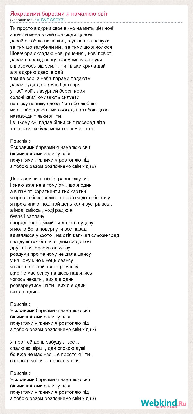 Ти просто відкрий своє вікно на мить цієї ночі запусти мене в свій сон сюди щоночі давай з тобою пошепки , в унісон на пошуки за тим що загубили ми , за тими що я молюся Щовечора складаю нові речення , нові повісті, давай на захід сонця візьмемося за руки відірвемось від землі , ти тільки крила дай а я відкрию двері в рай там де зорі з неба парами падають давай туди де не має бід і горя у твої мрії , лазурний берег моря солоні хвилі омивають силуети на піску напишу слова " я тебе люблю" ми з тобою двоє , ми сьогодні з тобою двоє назавжди тільки я і ти і в цьому сні падав білий сніг посеред літа та тільки ти була моїм теплом зігріта Приспів : Яскравими барвами я намалюю світ білими квітами залишу слід почуттями ніжними я розтоплю лід з тобою разом розпочнемо свій хід (2) День замінить ніч і я розплющу очі і знаю вже не в тому річ , що я один а в пам'яті фрагменти тих картин я просто божеволію , просто я до тебе хочу я проклинаю іноді той день коли зустрілись , а іноді сміюсь ,іноді радію я, буває і заплачу і поряд оберіг який ти дала на удачу я молю Бога повернути все назад вдивляюся у фото , на стіл кап-кап сльози-град і на душі так боляче , дим виїдає очі друга ночі розрив альянсу роздуми про те чому не дала шансу у нашому кіно кінець сеансу я вже не герой твого романсу вже не має сенсу на щось надіятись чогось чекати , вихід є один розвернутись і піти , вихід є один , вихід є один... Приспів : Яскравими барвами я намалюю світ білими квітами залишу слід почуттями ніжними я розтоплю лід з тобою разом розпочнемо свій хід (2) Я про той день забуду .. все .. спалю всі вірші , дам спокою душі бо вже не має нас .. є просто я і ти , є просто я і ти ... просто я і ти .. Приспів : Яскравими барвами я намалюю світ білими квітами залишу слід почуттями ніжними я розтоплю лід з тобою разом розпочнемо свій хід (3)