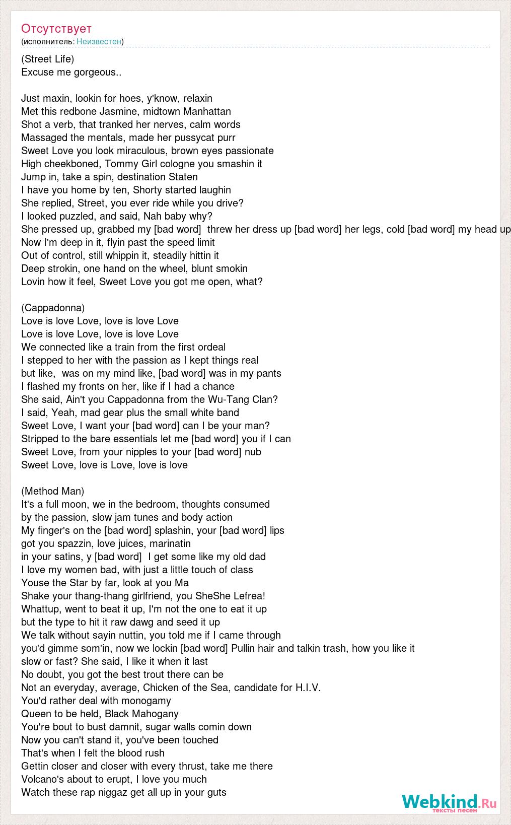 (Street Life) Excuse me gorgeous.. Just maxin, lookin for hoes, y'know, relaxin Met this redbone Jasmine, midtown Manhattan Shot a verb, that tranked her nerves, calm words Massaged the mentals, made her pussycat purr Sweet Love you look miraculous, brown eyes passionate High cheekboned, Tommy Girl cologne you smashin it Jump in, take a spin, destination Staten I have you home by ten, Shorty started laughin She replied, Street, you ever ride while you drive? I looked puzzled, and said, Nah baby why? She pressed up, grabbed my [bad word] threw her dress up [bad word] her legs, cold [bad word] my head up Now I'm deep in it, flyin past the speed limit Out of control, still whippin it, steadily hittin it Deep strokin, one hand on the wheel, blunt smokin Lovin how it feel, Sweet Love you got me open, what? (Cappadonna) Love is love Love, love is love Love Love is love Love, love is love Love We connected like a train from the first ordeal I stepped to her with the passion as I kept things real but like, was on my mind like, [bad word] was in my pants I flashed my fronts on her, like if I had a chance She said, Ain't you Cappadonna from the Wu-Tang Clan? I said, Yeah, mad gear plus the small white band Sweet Love, I want your [bad word] can I be your man? Stripped to the bare essentials let me [bad word] you if I can Sweet Love, from your nipples to your [bad word] nub Sweet Love, love is Love, love is love (Method Man) It's a full moon, we in the bedroom, thoughts consumed by the passion, slow jam tunes and body action My finger's on the [bad word] splashin, your [bad word] lips got you spazzin, love juices, marinatin in your satins, y [bad word] I get some like my old dad I love my women bad, with just a little touch of class Youse the Star by far, look at you Ma Shake your thang-thang girlfriend, you SheShe Lefrea! Whattup, went to beat it up, I'm not the one to eat it up but the type to hit it raw dawg and seed it up We talk without sayin nuttin, you told me if I came through you'd gimme som'in, now we lockin [bad word] Pullin hair and talkin trash, how you like it slow or fast? She said, I like it when it last No doubt, you got the best trout there can be Not an everyday, average, Chicken of the Sea, candidate for H.I.V. You'd rather deal with monogamy Queen to be held, Black Mahogany You're bout to bust damnit, sugar walls comin down Now you can't stand it, you've been touched That's when I felt the blood rush Gettin closer and closer with every thrust, take me there Volcano's about to erupt, I love you much Watch these rap niggaz get all up in your guts