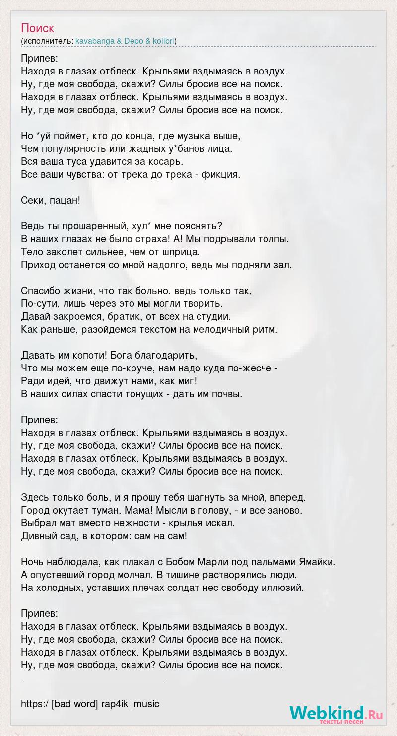 Припев: Находя в глазах отблеск. Крыльями вздымаясь в воздух. Ну, где моя свобода, скажи? Силы бросив все на поиск. Находя в глазах отблеск. Крыльями вздымаясь в воздух. Ну, где моя свобода, скажи? Силы бросив все на поиск. Но *уй поймет, кто до конца, где музыка выше, Чем популярность или жадных у*банов лица. Вся ваша туса удавится за косарь. Все ваши чувства: от трека до трека - фикция. Секи, пацан! Ведь ты прошаренный, хул* мне пояснять? В наших глазах не было страха! А! Мы подрывали толпы. Тело заколет сильнее, чем от шприца. Приход останется со мной надолго, ведь мы подняли зал. Спасибо жизни, что так больно. ведь только так, По-сути, лишь через это мы могли творить. Давай закроемся, братик, от всех на студии. Как раньше, разойдемся текстом на мелодичный ритм. Давать им копоти! Бога благодарить, Что мы можем еще по-круче, нам надо куда по-жесче - Ради идей, что движут нами, как миг! В наших силах спасти тонущих - дать им почвы. Припев: Находя в глазах отблеск. Крыльями вздымаясь в воздух. Ну, где моя свобода, скажи? Силы бросив все на поиск. Находя в глазах отблеск. Крыльями вздымаясь в воздух. Ну, где моя свобода, скажи? Силы бросив все на поиск. Здесь только боль, и я прошу тебя шагнуть за мной, вперед. Город окутает туман. Мама! Мысли в голову, - и все заново. Выбрал мат вместо нежности - крылья искал. Дивный сад, в котором: сам на сам! Ночь наблюдала, как плакал с Бобом Марли под пальмами Ямайки. А опустевший город молчал. В тишине растворялись люди. На холодных, уставших плечах солдат нес свободу иллюзий. Припев: Находя в глазах отблеск. Крыльями вздымаясь в воздух. Ну, где моя свобода, скажи? Силы бросив все на поиск. Находя в глазах отблеск. Крыльями вздымаясь в воздух. Ну, где моя свобода, скажи? Силы бросив все на поиск. __________________________ https:/ [bad word] rap4ik_music