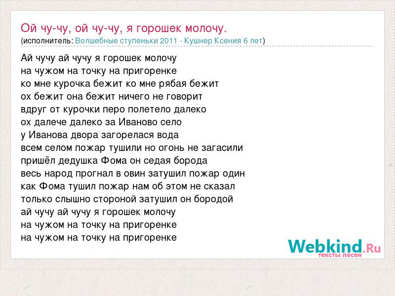 Ай чучу ай чучу я горошек молочу на чужом на точку на пригоренке ко мне курочка бежит ко мне рябая бежит ох бежит она бежит ничего не говорит вдруг от курочки перо полетело далеко ох далече далеко за Иваново село у Иванова двора загорелася вода всем селом пожар тушили но огонь не загасили пришёл дедушка Фома он седая борода весь народ прогнал в овин затушил пожар один как Фома тушил пожар нам об этом не сказал только слышно стороной затушил он бородой ай чучу ай чучу я горошек молочу на чужом на точку на пригоренке на чужом на точку на пригоренке