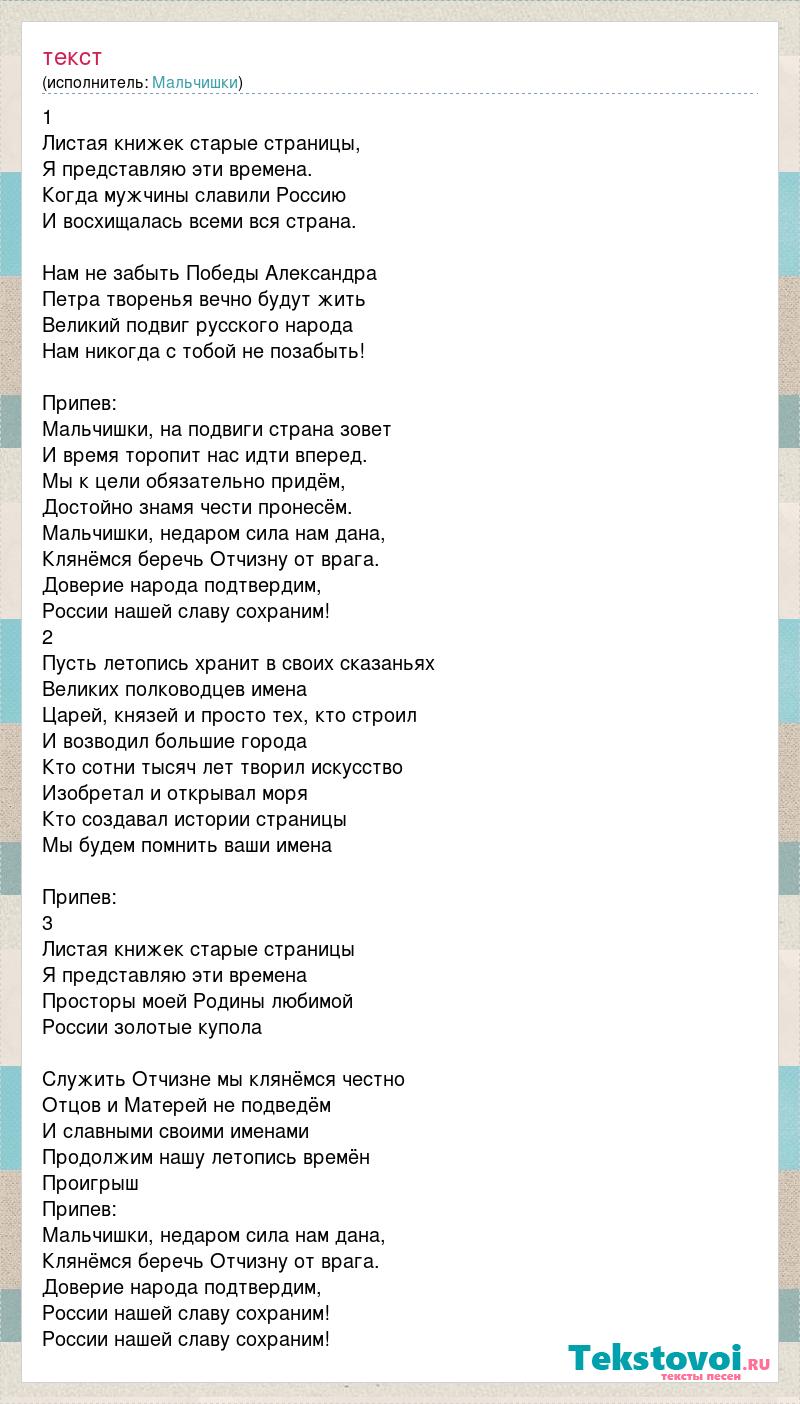 1 Листая книжек старые страницы, Я представляю эти времена. Когда мужчины славили Россию И восхищалась всеми вся страна. Нам не забыть Победы Александра Петра творенья вечно будут жить Великий подвиг русского народа Нам никогда с тобой не позабыть! Припев: Мальчишки, на подвиги страна зовет И время торопит нас идти вперед. Мы к цели обязательно придём, Достойно знамя чести пронесём. Мальчишки, недаром сила нам дана, Клянёмся беречь Отчизну от врага. Доверие народа подтвердим, России нашей славу сохраним! 2 Пусть летопись хранит в своих сказаньях Великих полководцев имена Царей, князей и просто тех, кто строил И возводил большие города Кто сотни тысяч лет творил искусство Изобретал и открывал моря Кто создавал истории страницы Мы будем помнить ваши имена Припев: 3 Листая книжек старые страницы Я представляю эти времена Просторы моей Родины любимой России золотые купола Служить Отчизне мы клянёмся честно Отцов и Матерей не подведём И славными своими именами Продолжим нашу летопись времён Проигрыш Припев: Мальчишки, недаром сила нам дана, Клянёмся беречь Отчизну от врага. Доверие народа подтвердим, России нашей славу сохраним! России нашей славу сохраним!