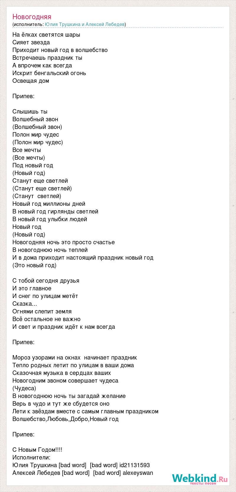 На ёлках светятся шары Сияет звезда Приходит новый год в волшебство Встречаешь праздник ты А впрочем как всегда Искрит бенгальский огонь Освещая дом Припев: Слышишь ты Волшебный звон (Волшебный звон) Полон мир чудес (Полон мир чудес) Все мечты (Все мечты) Под новый год (Новый год) Станут еще светлей (Станут еще светлей) (Станут светлей) Новый год миллионы дней В новый год гирлянды светлей В новый год улыбки людей Новый год (Новый год) Новогодняя ночь это просто счастье В новогоднюю ночь теплей И в дома приходит настоящий праздник новый год (Это новый год) С тобой сегодня друзья И это главное И снег по улицам метёт Сказка... Огнями слепит земля Всё остальное не важно И свет и праздник идёт к нам всегда Припев: Мороз узорами на окнах начинает праздник Тепло родных летит по улицам в ваши дома Сказочная музыка в сердцах ваших Новогодним звоном совершает чудеса (Чудеса) В новогоднюю ночь ты загадай желание Верь в чудо и тут же сбудется оно Лети к звёздам вместе с самым главным праздником Волшебство,Любовь,Добро,Новый год Припев: С Новым Годом!!!! Исполнители: Юлия Трушкина [bad word] [bad word] id21131593 Алексей Лебедев [bad word] [bad word] alexeyswan