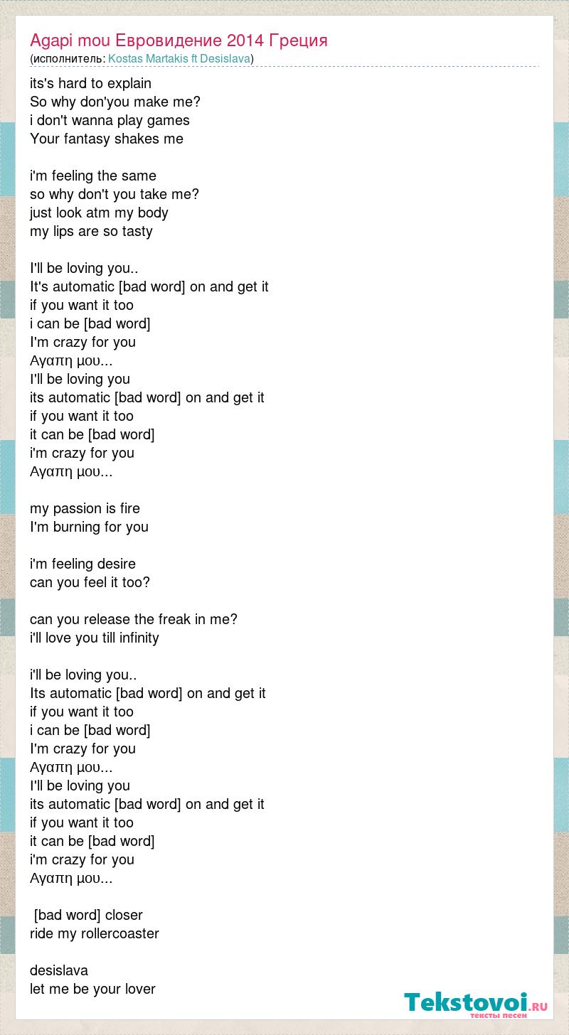 its's hard to explain So why don'you make me? i don't wanna play games Your fantasy shakes me i'm feeling the same so why don't you take me? just look atm my body my lips are so tasty I'll be loving you.. It's automatic [bad word] on and get it if you want it too i can be [bad word] I'm crazy for you Αγαπη μου... Ι'll be loving you its automatic [bad word] on and get it if you want it too it can be [bad word] i'm crazy for you Αγαπη μου... my passion is fire I'm burning for you i'm feeling desire can you feel it too? can you release the freak in me? i'll love you till infinity i'll be loving you.. Its automatic [bad word] on and get it if you want it too i can be [bad word] I'm crazy for you Αγαπη μου... Ι'll be loving you its automatic [bad word] on and get it if you want it too it can be [bad word] i'm crazy for you Αγαπη μου... [bad word] closer ride my rollercoaster desislava let me be your lover