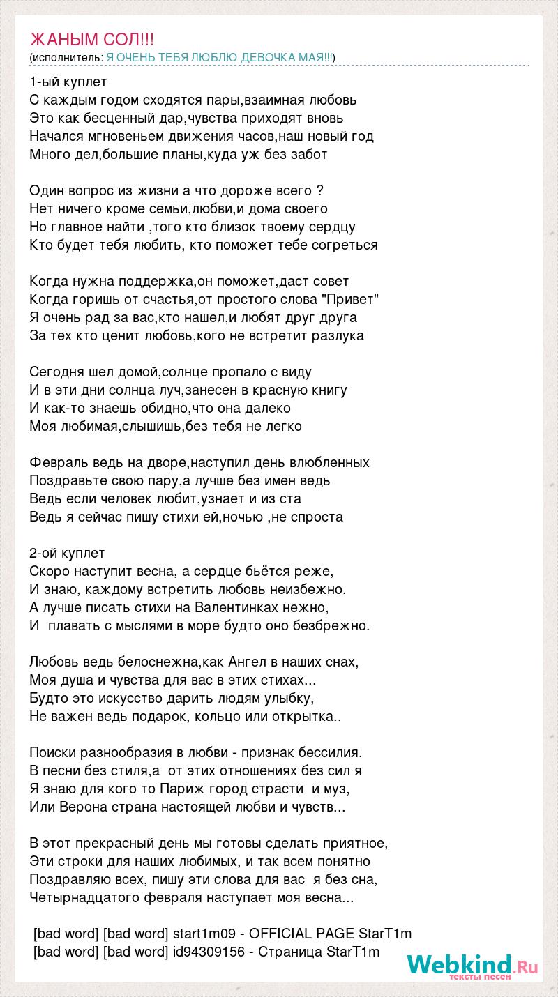 1-ый куплет С каждым годом сходятся пары,взаимная любовь Это как бесценный дар,чувства приходят вновь Начался мгновеньем движения часов,наш новый год Много дел,большие планы,куда уж без забот Один вопрос из жизни а что дороже всего ? Нет ничего кроме семьи,любви,и дома своего Но главное найти ,того кто близок твоему сердцу Кто будет тебя любить, кто поможет тебе согреться Когда нужна поддержка,он поможет,даст совет Когда горишь от счастья,от простого слова "Привет" Я очень рад за вас,кто нашел,и любят друг друга За тех кто ценит любовь,кого не встретит разлука Сегодня шел домой,солнце пропало с виду И в эти дни солнца луч,занесен в красную книгу И как-то знаешь обидно,что она далеко Моя любимая,слышишь,без тебя не легко Февраль ведь на дворе,наступил день влюбленных Поздравьте свою пару,а лучше без имен ведь Ведь если человек любит,узнает и из ста Ведь я сейчас пишу стихи ей,ночью ,не спроста 2-ой куплет Скоро наступит весна, а сердце бьётся реже, И знаю, каждому встретить любовь неизбежно. А лучше писать стихи на Валентинках нежно, И плавать с мыслями в море будто оно безбрежно. Любовь ведь белоснежна,как Ангел в наших снах, Моя душа и чувства для вас в этих стихах... Будто это искусство дарить людям улыбку, Не важен ведь подарок, кольцо или открытка.. Поиски разнообразия в любви - признак бессилия. В песни без стиля,а от этих отношениях без сил я Я знаю для кого то Париж город страсти и муз, Или Верона страна настоящей любви и чувств... В этот прекрасный день мы готовы сделать приятное, Эти строки для наших любимых, и так всем понятно Поздравляю всех, пишу эти слова для вас я без сна, Четырнадцатого февраля наступает моя весна... [bad word] [bad word] start1m09 - OFFICIAL PAGE StarT1m [bad word] [bad word] id94309156 - Страница StarT1m