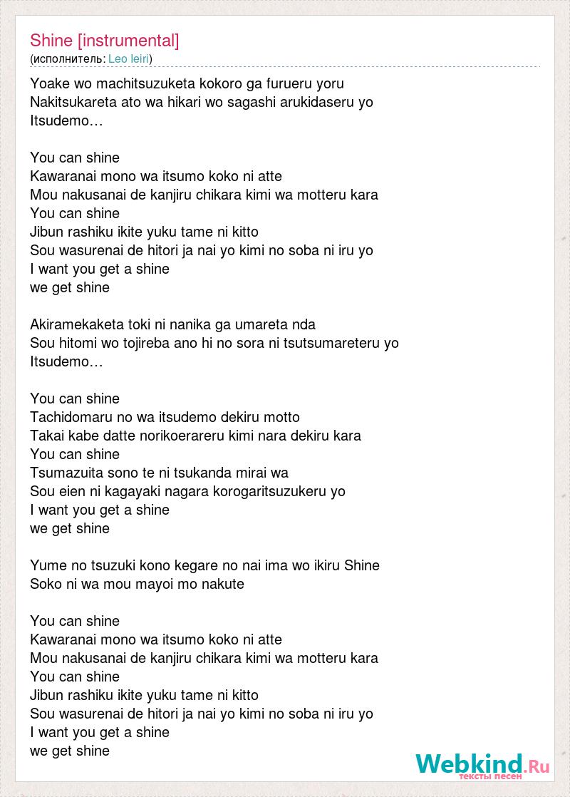 Yoake wo machitsuzuketa kokoro ga furueru yoru Nakitsukareta ato wa hikari wo sagashi arukidaseru yo Itsudemo… You can shine Kawaranai mono wa itsumo koko ni atte Mou nakusanai de kanjiru chikara kimi wa motteru kara You can shine Jibun rashiku ikite yuku tame ni kitto Sou wasurenai de hitori ja nai yo kimi no soba ni iru yo I want you get a shine we get shine Akiramekaketa toki ni nanika ga umareta nda Sou hitomi wo tojireba ano hi no sora ni tsutsumareteru yo Itsudemo… You can shine Tachidomaru no wa itsudemo dekiru motto Takai kabe datte norikoerareru kimi nara dekiru kara You can shine Tsumazuita sono te ni tsukanda mirai wa Sou eien ni kagayaki nagara korogaritsuzukeru yo I want you get a shine we get shine Yume no tsuzuki kono kegare no nai ima wo ikiru Shine Soko ni wa mou mayoi mo nakute You can shine Kawaranai mono wa itsumo koko ni atte Mou nakusanai de kanjiru chikara kimi wa motteru kara You can shine Jibun rashiku ikite yuku tame ni kitto Sou wasurenai de hitori ja nai yo kimi no soba ni iru yo I want you get a shine we get shine