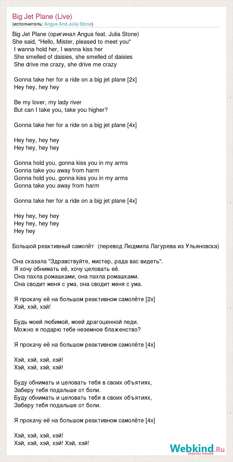 Big Jet Plane (оригинал Angus feat. Julia Stone) She said, "Hello, Mister, pleased to meet you" I wanna hold her, I wanna kiss her She smelled of daisies, she smelled of daisies She drive me crazy, she drive me crazy Gonna take her for a ride on a big jet plane [2x] Hey hey, hey hey Be my lover, my lady river But can I take you, take you higher? Gonna take her for a ride on a big jet plane [4x] Hey hey, hey hey Hey hey, hey hey Gonna hold you, gonna kiss you in my arms Gonna take you away from harm Gonna hold you, gonna kiss you in my arms Gonna take you away from harm Gonna take her for a ride on a big jet plane [4x] Hey hey, hey hey Hey hey, hey hey Hey hey Большой реактивный самолёт (перевод Людмила Лагурева из Ульяновска) Она сказала "Здравствуйте, мистер, рада вас видеть". Я хочу обнимать её, хочу целовать её. Она пахла ромашками, она пахла ромашками. Она сводит меня с ума, она сводит меня с ума. Я прокачу её на большом реактивном самолёте [2x] Хэй, хэй, хэй! Будь моей любимой, моей драгоценной леди. Можно я подарю тебе неземное блаженство? Я прокачу её на большом реактивном самолёте [4x] Хэй, хэй, хэй, хэй! Хэй, хэй, хэй, хэй! Буду обнимать и целовать тебя в своих объятиях, Заберу тебя подальше от боли. Буду обнимать и целовать тебя в своих объятиях, Заберу тебя подальше от боли. Я прокачу её на большом реактивном самолёте [4x] Хэй, хэй, хэй, хэй! Хэй, хэй, хэй, хэй! Хэй, хэй!