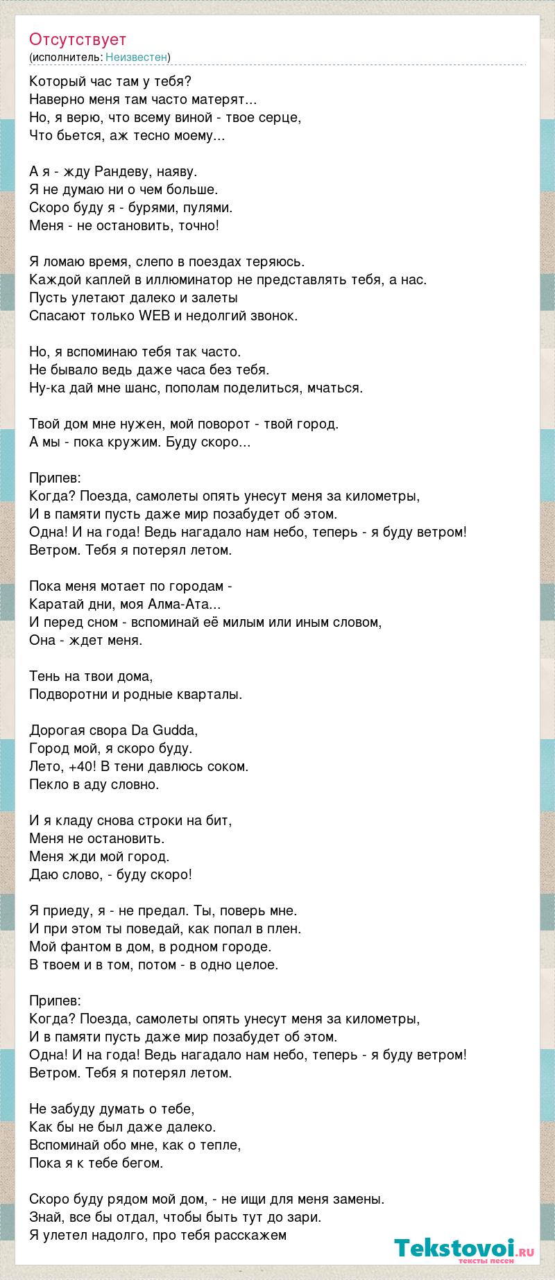Который час там у тебя? Наверно меня там часто матерят... Но, я верю, что всему виной - твое серце, Что бьется, аж тесно моему... А я - жду Рандеву, наяву. Я не думаю ни о чем больше. Скоро буду я - бурями, пулями. Меня - не остановить, точно! Я ломаю время, слепо в поездах теряюсь. Каждой каплей в иллюминатор не представлять тебя, а нас. Пусть улетают далеко и залеты Спасают только WEB и недолгий звонок. Но, я вспоминаю тебя так часто. Не бывало ведь даже часа без тебя. Ну-ка дай мне шанс, пополам поделиться, мчаться. Твой дом мне нужен, мой поворот - твой город. А мы - пока кружим. Буду скоро... Припев: Когда? Поезда, самолеты опять унесут меня за километры, И в памяти пусть даже мир позабудет об этом. Одна! И на года! Ведь нагадало нам небо, теперь - я буду ветром! Ветром. Тебя я потерял летом. Пока меня мотает по городам - Каратай дни, моя Алма-Ата... И перед сном - вспоминай её милым или иным словом, Она - ждет меня. Тень на твои дома, Подворотни и родные кварталы. Дорогая свора Da Gudda, Город мой, я скоро буду. Лето, +40! В тени давлюсь соком. Пекло в аду словно. И я кладу снова строки на бит, Меня не остановить. Меня жди мой город. Даю слово, - буду скоро! Я приеду, я - не предал. Ты, поверь мне. И при этом ты поведай, как попал в плен. Мой фантом в дом, в родном городе. В твоем и в том, потом - в одно целое. Припев: Когда? Поезда, самолеты опять унесут меня за километры, И в памяти пусть даже мир позабудет об этом. Одна! И на года! Ведь нагадало нам небо, теперь - я буду ветром! Ветром. Тебя я потерял летом. Не забуду думать о тебе, Как бы не был даже далеко. Вспоминай обо мне, как о тепле, Пока я к тебе бегом. Скоро буду рядом мой дом, - не ищи для меня замены. Знай, все бы отдал, чтобы быть тут до зари. Я улетел надолго, про тебя расскажем