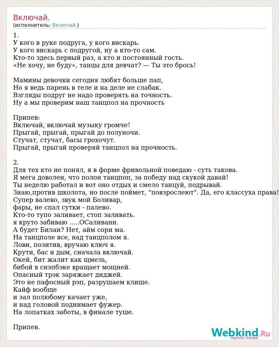 1. У кого в руке подруга, у кого вискарь. У кого вискарь с подругой, ну а кто-то сам. Кто-то здесь первый раз, а кто и постоянный гость. «Не хочу, не буду», танцы для девчат? — Ты это брось! Мамины девочки сегодня любят больше пап, Но я ведь парень в теле и на деле не слабак. Взгляды подруг не надо проверять на точность. Ну а мы проверим наш танцпол на прочность Припев: Включай, включай музыку громче! Прыгай, прыгай, прыгай до полуночи. Стучат, стучат, басы грохочут. Прыгай, прыгай проверяй танцпол на прочность. 2. Для тех кто не понял, я в форме фривольной поведаю - суть такова. Я мега доволен, что полон танцпоп, за победу над скукой давай! Ты неделю работал и вот оно отдых и смело танцуй, подрывай. Знаю,против школота, но после поймет, "повзрослеют". Да, его классуха права! Супер валево, звук мой Боливар, фары, не спал сутки - палево. Кто-то тупо заливает, стоп заливать. я круто забиваю .....ОСаливанн. А будет Билан? Нет, айм сори ма. На танцполе все, над танцполом я. Лови, позитив, вручаю ключ я. Крути, бас и дым, сначала включай. Окей, бит жалит как щмель, бибой в снэпбэке вращает мощней. Опасный трэк заряжает диджей. Это не пафосный рэп, разрушаем клише. Кайф вообще и зал полюбому качает уже, и над головой поднимает фужер. На лопатках заботы, в финале туше. Припев.