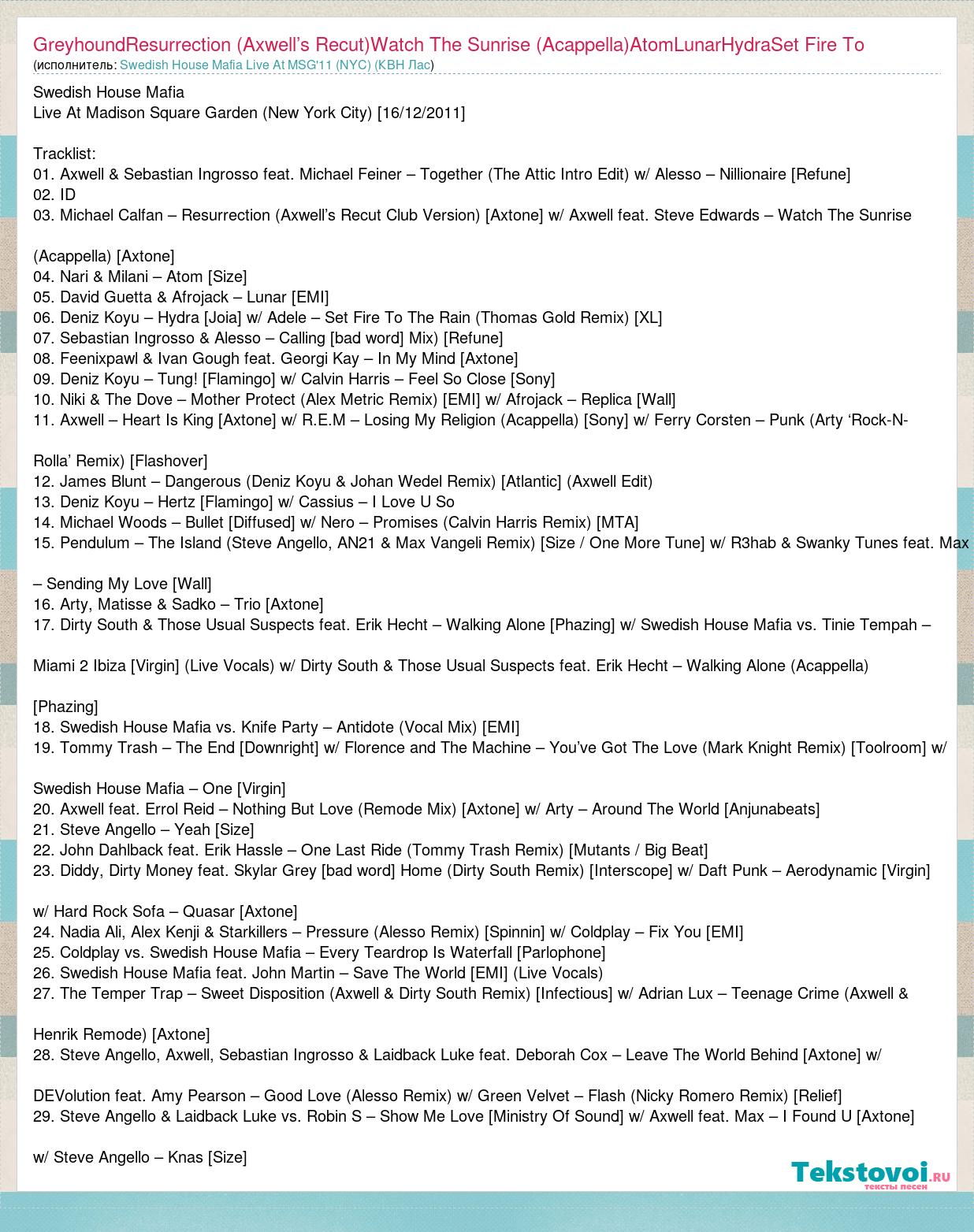 Swedish House Mafia Live At Madison Square Garden (New York City) [16/12/2011] Tracklist: 01. Axwell & Sebastian Ingrosso feat. Michael Feiner – Together (The Attic Intro Edit) w/ Alesso – Nillionaire [Refune] 02. ID 03. Michael Calfan – Resurrection (Axwell’s Recut Club Version) [Axtone] w/ Axwell feat. Steve Edwards – Watch The Sunrise (Acappella) [Axtone] 04. Nari & Milani – Atom [Size] 05. David Guetta & Afrojack – Lunar [EMI] 06. Deniz Koyu – Hydra [Joia] w/ Adele – Set Fire To The Rain (Thomas Gold Remix) [XL] 07. Sebastian Ingrosso & Alesso – Calling [bad word] Mix) [Refune] 08. Feenixpawl & Ivan Gough feat. Georgi Kay – In My Mind [Axtone] 09. Deniz Koyu – Tung! [Flamingo] w/ Calvin Harris – Feel So Close [Sony] 10. Niki & The Dove – Mother Protect (Alex Metric Remix) [EMI] w/ Afrojack – Replica [Wall] 11. Axwell – Heart Is King [Axtone] w/ R.E.M – Losing My Religion (Acappella) [Sony] w/ Ferry Corsten – Punk (Arty ‘Rock-N- Rolla’ Remix) [Flashover] 12. James Blunt – Dangerous (Deniz Koyu & Johan Wedel Remix) [Atlantic] (Axwell Edit) 13. Deniz Koyu – Hertz [Flamingo] w/ Cassius – I Love U So 14. Michael Woods – Bullet [Diffused] w/ Nero – Promises (Calvin Harris Remix) [MTA] 15. Pendulum – The Island (Steve Angello, AN21 & Max Vangeli Remix) [Size / One More Tune] w/ R3hab & Swanky Tunes feat. Max – Sending My Love [Wall] 16. Arty, Matisse & Sadko – Trio [Axtone] 17. Dirty South & Those Usual Suspects feat. Erik Hecht – Walking Alone [Phazing] w/ Swedish House Mafia vs. Tinie Tempah – Miami 2 Ibiza [Virgin] (Live Vocals) w/ Dirty South & Those Usual Suspects feat. Erik Hecht – Walking Alone (Acappella) [Phazing] 18. Swedish House Mafia vs. Knife Party – Antidote (Vocal Mix) [EMI] 19. Tommy Trash – The End [Downright] w/ Florence and The Machine – You’ve Got The Love (Mark Knight Remix) [Toolroom] w/ Swedish House Mafia – One [Virgin] 20. Axwell feat. Errol Reid – Nothing But Love (Remode Mix) [Axtone] w/ Arty – Around The World [Anjunabeats] 21. Steve Angello – Yeah [Size] 22. John Dahlback feat. Erik Hassle – One Last Ride (Tommy Trash Remix) [Mutants / Big Beat] 23. Diddy, Dirty Money feat. Skylar Grey [bad word] Home (Dirty South Remix) [Interscope] w/ Daft Punk – Aerodynamic [Virgin] w/ Hard Rock Sofa – Quasar [Axtone] 24. Nadia Ali, Alex Kenji & Starkillers – Pressure (Alesso Remix) [Spinnin] w/ Coldplay – Fix You [EMI] 25. Coldplay vs. Swedish House Mafia – Every Teardrop Is Waterfall [Parlophone] 26. Swedish House Mafia feat. John Martin – Save The World [EMI] (Live Vocals) 27. The Temper Trap – Sweet Disposition (Axwell & Dirty South Remix) [Infectious] w/ Adrian Lux – Teenage Crime (Axwell & Henrik Remode) [Axtone] 28. Steve Angello, Axwell, Sebastian Ingrosso & Laidback Luke feat. Deborah Cox – Leave The World Behind [Axtone] w/ DEVolution feat. Amy Pearson – Good Love (Alesso Remix) w/ Green Velvet – Flash (Nicky Romero Remix) [Relief] 29. Steve Angello & Laidback Luke vs. Robin S – Show Me Love [Ministry Of Sound] w/ Axwell feat. Max – I Found U [Axtone] w/ Steve Angello – Knas [Size]