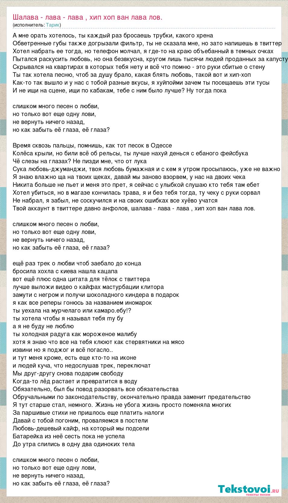 А мне орать хотелось, ты каждый раз бросаешь трубки, какого хрена Обветренные губы также догрызали фильтр, ты не сказала мне, но зато напишешь в твиттер Хотел набрать ее тогда, но телефон молчал, я где-то на краю объебанный в темных очках Пытался раскусить любовь, но она безвкусна, кругом лишь тысячи людей проданных за капусту Скрывался на квартирах в которых тебя нету и всё что помню - это руки сбитые о стену Ты так хотела песню, чтоб за душу брало, какая блять любовь, такой вот и хип-хоп Как-то так вышло и у нас с тобой разные вкусы, я хуйпойми зачем ты посещаешь эти тусы И не ищи на сцене, ищи по кабакам, тебе с ним было лучше? Ну тогда пока слишком много песен о любви, но только вот еще одну лови, не вернуть ничего назад, но как забыть её глаза, её глаза? Время сквозь пальцы, помнишь, как тот песок в Одессе Колёса крыли, но били всё об рельсы, ты лучше нахуй денься с ебаного фейсбука Чё слезы на глазах? Не пизди мне, что от лука Сука любовь-джуманджи, твоя любовь бумажная и с кем я утром просыпаюсь, уже не важно Я знаю влажно ща на твоих щеках, давай мы заново взорвем, у нас на двоих чека Никита больше не пьет и меня это прет, я сейчас с улыбкой слушаю кто тебя там ебет Хотел убиться, но в магазе кончилась трава, я и без тебя тогда, ту чеку с руки сорвал Не набрал, я забыл, не соскучился и на своих ошибках все хуёво учатся Твой аккаунт в твиттере давно анфолов, шалава - лава - лава , хип хоп ван лава лов. слишком много песен о любви, но только вот еще одну лови, не вернуть ничего назад, но как забыть её глаза, её глаза? ещё раз трек о любви чтоб заебало до конца бросила хохла с киева нашла кацапа вот ещё плюс одна цитата для тёлок с твиттера лучше выложи видео о кайфах мастурбации клитора замути с негром и получи шоколадного киндера в подарок я как все реперы гонюсь за названием иномарок ты уехала на мурчелаго или камаро.ебу!? ты хотела чтобы я называл тебя my бу а я не буду не люблю ты холодная радуга как мороженое малибу хотя я знаю что все на тебя клюют как стервятники на мясо извини но я поджог и всё погасло.. и тут меня кроме, есть еще кто-то на иконе и людей куча, что недослушав трек, переключат Мы друг-другу снова подарим свободу Когда-то лёд растает и превратится в воду Обязательно, был бы повод разорвать все обязательства Обручальными по законодательству, окончательно правда заменит предательство Я тут старше стал, немного. Жизнь не убога жизнь просто поменяла многих За паршивые стихи не пришлось еще платить налоги Давай с тобой погоним, проваляемся в постели Любовь-дешевый кайф, на который мы подсели Батарейка из неё сесть пока не успела До утра слились в одну два одиноких тела слишком много песен о любви, но только вот еще одну лови, не вернуть ничего назад, но как забыть её глаза, её глаза?