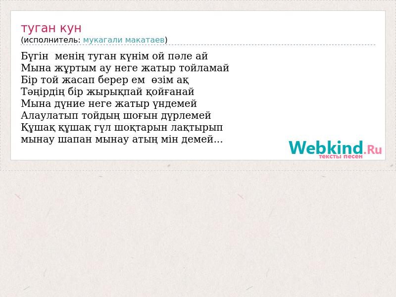 Бүгін менің туган күнім ой пәле ай Мына жұртым ау неге жатыр тойламай Бір той жасап берер ем өзім ақ Тәңірдің бір жырықпай қойғанай Мына дүние неге жатыр үндемей Алаулатып тойдың шоғын дүрлемей Құшақ құшақ гүл шоқтарын лақтырып мынау шапан мынау атың мін демей...