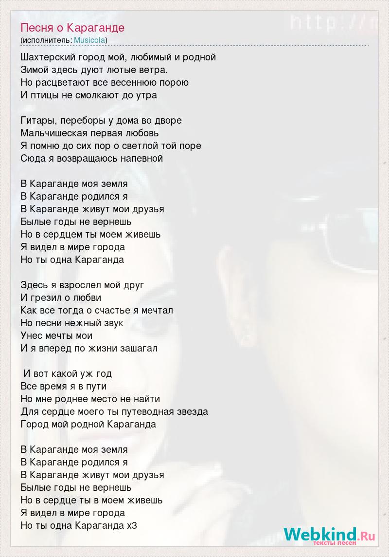 Шахтерский город мой, любимый и родной Зимой здесь дуют лютые ветра. Но расцветают все весеннюю порою И птицы не смолкают до утра Гитары, переборы у дома во дворе Мальчишеская первая любовь Я помню до сих пор о светлой той поре Сюда я возвращаюсь напевной В Караганде моя земля В Караганде родился я В Караганде живут мои друзья Былые годы не вернешь Но в сердцем ты моем живешь Я видел в мире города Но ты одна Караганда Здесь я взрослел мой друг И грезил о любви Как все тогда о счастье я мечтал Но песни нежный звук Унес мечты мои И я вперед по жизни зашагал И вот какой уж год Все время я в пути Но мне роднее место не найти Для сердце моего ты путеводная звезда Город мой родной Караганда В Караганде моя земля В Караганде родился я В Караганде живут мои друзья Былые годы не вернешь Но в сердце ты в моем живешь Я видел в мире города Но ты одна Караганда x3