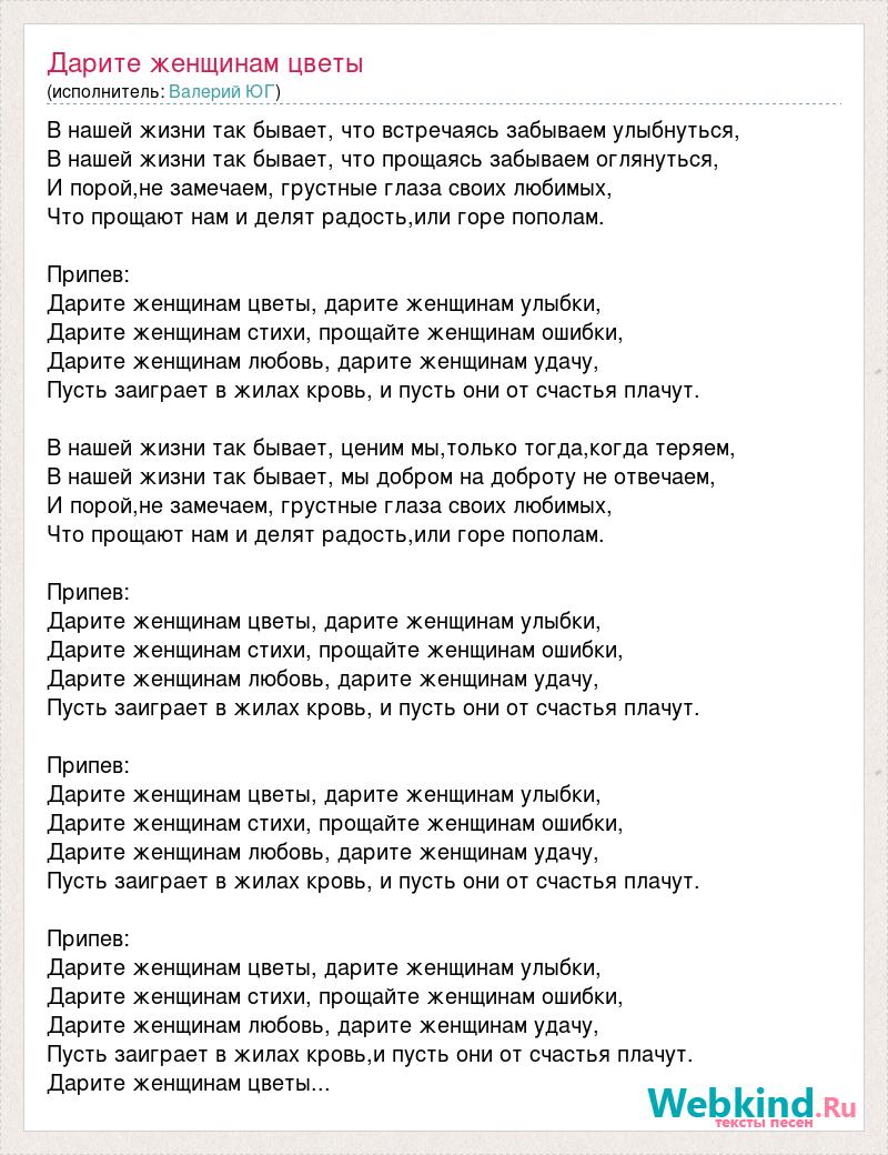 В нашей жизни так бывает, что встречаясь забываем улыбнуться, В нашей жизни так бывает, что прощаясь забываем оглянуться, И порой,не замечаем, грустные глаза своих любимых, Что прощают нам и делят радость,или горе пополам. Припев: Дарите женщинам цветы, дарите женщинам улыбки, Дарите женщинам стихи, прощайте женщинам ошибки, Дарите женщинам любовь, дарите женщинам удачу, Пусть заиграет в жилах кровь, и пусть они от счастья плачут. В нашей жизни так бывает, ценим мы,только тогда,когда теряем, В нашей жизни так бывает, мы добром на доброту не отвечаем, И порой,не замечаем, грустные глаза своих любимых, Что прощают нам и делят радость,или горе пополам. Припев: Дарите женщинам цветы, дарите женщинам улыбки, Дарите женщинам стихи, прощайте женщинам ошибки, Дарите женщинам любовь, дарите женщинам удачу, Пусть заиграет в жилах кровь, и пусть они от счастья плачут. Припев: Дарите женщинам цветы, дарите женщинам улыбки, Дарите женщинам стихи, прощайте женщинам ошибки, Дарите женщинам любовь, дарите женщинам удачу, Пусть заиграет в жилах кровь, и пусть они от счастья плачут. Припев: Дарите женщинам цветы, дарите женщинам улыбки, Дарите женщинам стихи, прощайте женщинам ошибки, Дарите женщинам любовь, дарите женщинам удачу, Пусть заиграет в жилах кровь,и пусть они от счастья плачут. Дарите женщинам цветы...