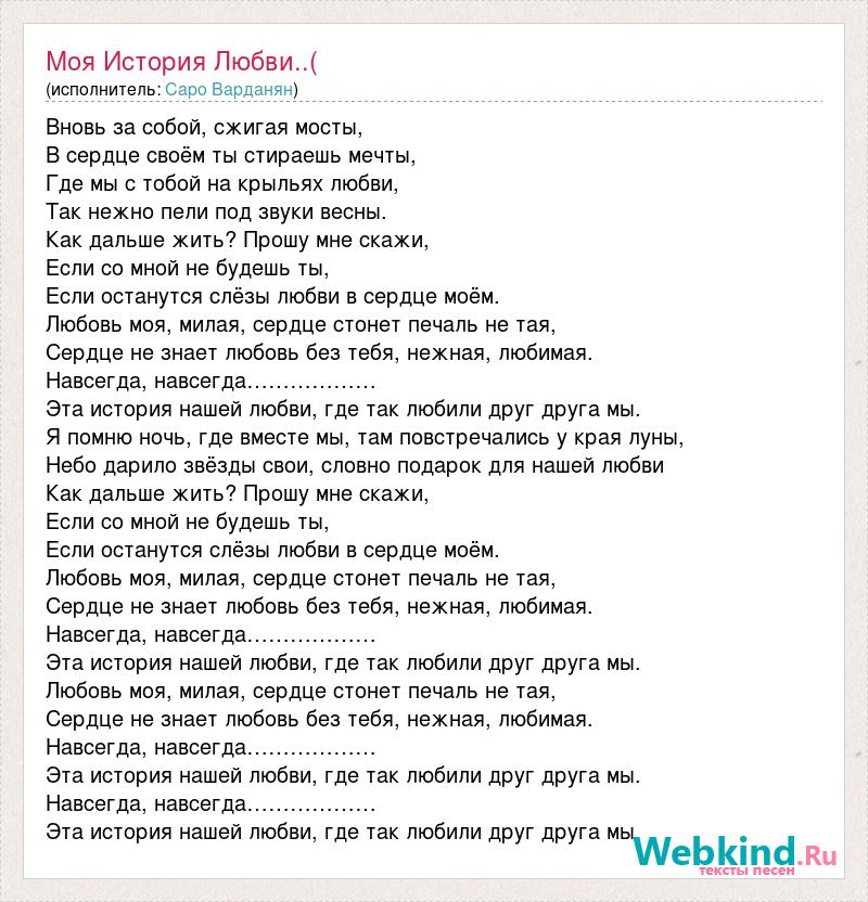 Вновь за собой, сжигая мосты, В сердце своём ты стираешь мечты, Где мы с тобой на крыльях любви, Так нежно пели под звуки весны. Как дальше жить? Прошу мне скажи, Если со мной не будешь ты, Если останутся слёзы любви в сердце моём. Любовь моя, милая, сердце стонет печаль не тая, Сердце не знает любовь без тебя, нежная, любимая. Навсегда, навсегда……………… Эта история нашей любви, где так любили друг друга мы. Я помню ночь, где вместе мы, там повстречались у края луны, Небо дарило звёзды свои, словно подарок для нашей любви Как дальше жить? Прошу мне скажи, Если со мной не будешь ты, Если останутся слёзы любви в сердце моём. Любовь моя, милая, сердце стонет печаль не тая, Сердце не знает любовь без тебя, нежная, любимая. Навсегда, навсегда……………… Эта история нашей любви, где так любили друг друга мы. Любовь моя, милая, сердце стонет печаль не тая, Сердце не знает любовь без тебя, нежная, любимая. Навсегда, навсегда……………… Эта история нашей любви, где так любили друг друга мы. Навсегда, навсегда……………… Эта история нашей любви, где так любили друг друга мы