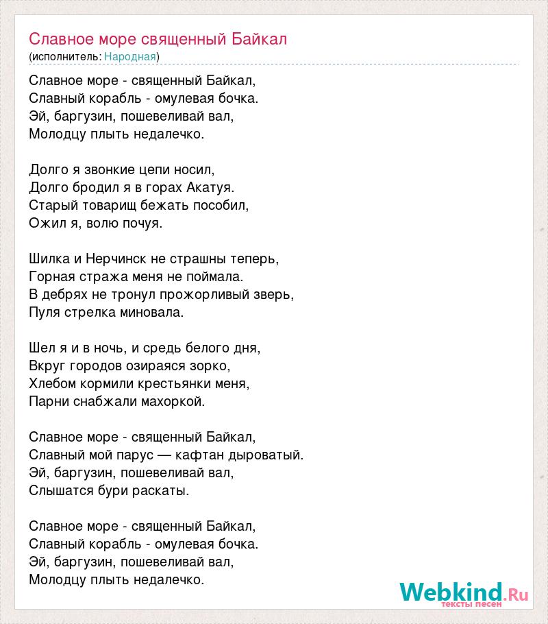 Славное море - священный Байкал, Славный корабль - омулевая бочка. Эй, баргузин, пошевеливай вал, Молодцу плыть недалечко. Долго я звонкие цепи носил, Долго бродил я в горах Акатуя. Старый товарищ бежать пособил, Ожил я, волю почуя. Шилка и Нерчинск не страшны теперь, Горная стража меня не поймала. В дебрях не тронул прожорливый зверь, Пуля стрелка миновала. Шел я и в ночь, и средь белого дня, Вкруг городов озираяся зорко, Хлебом кормили крестьянки меня, Парни снабжали махоркой. Славное море - священный Байкал, Славный мой парус — кафтан дыроватый. Эй, баргузин, пошевеливай вал, Слышатся бури раскаты. Славное море - священный Байкал, Славный корабль - омулевая бочка. Эй, баргузин, пошевеливай вал, Молодцу плыть недалечко.