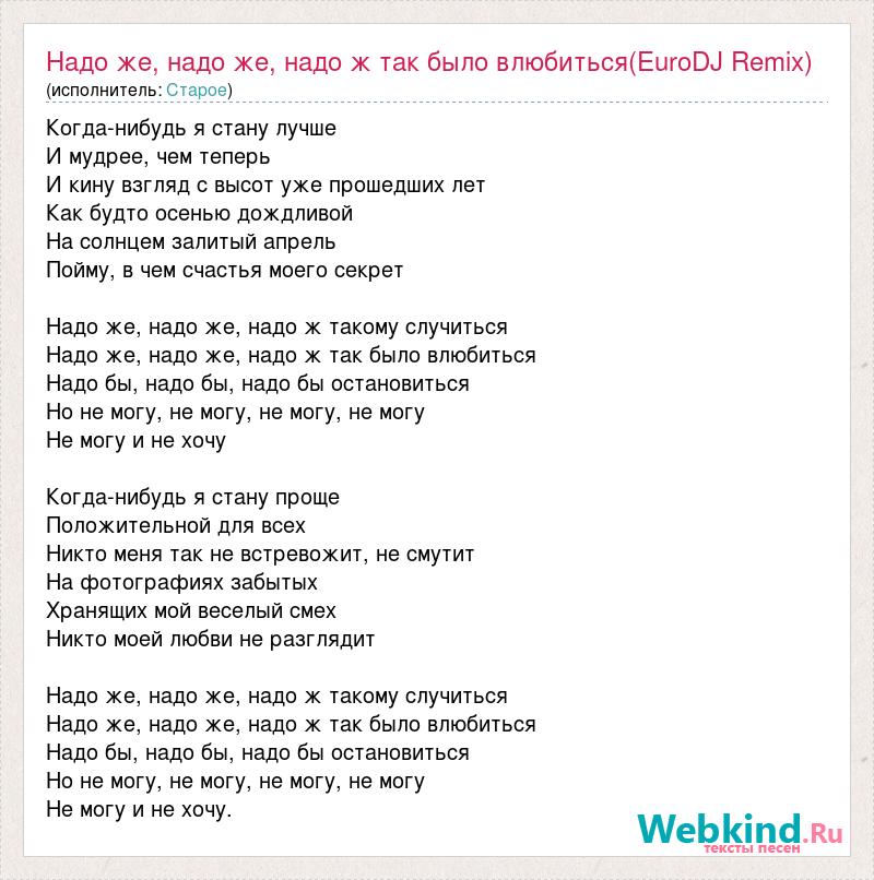 Когда-нибудь я стану лучше И мудрее, чем теперь И кину взгляд с высот уже прошедших лет Как будто осенью дождливой На солнцем залитый апрель Пойму, в чем счастья моего секрет Надо же, надо же, надо ж такому случиться Надо же, надо же, надо ж так было влюбиться Надо бы, надо бы, надо бы остановиться Но не могу, не могу, не могу, не могу Не могу и не хочу Когда-нибудь я стану проще Положительной для всех Никто меня так не встревожит, не смутит На фотографиях забытых Хранящих мой веселый смех Никто моей любви не разглядит Надо же, надо же, надо ж такому случиться Надо же, надо же, надо ж так было влюбиться Надо бы, надо бы, надо бы остановиться Но не могу, не могу, не могу, не могу Не могу и не хочу.