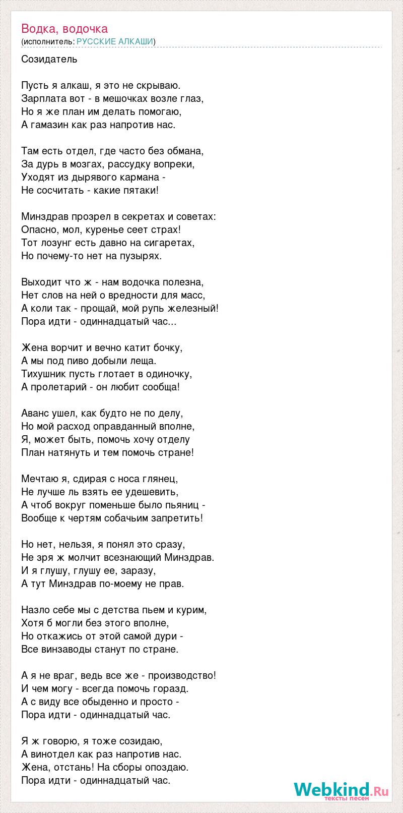 Созидатель Пусть я алкаш, я это не скрываю. Зарплата вот - в мешочках возле глаз, Но я же план им делать помогаю, А гамазин как раз напротив нас. Там есть отдел, где часто без обмана, За дурь в мозгах, рассудку вопреки, Уходят из дырявого кармана - Не сосчитать - какие пятаки! Минздрав прозрел в секретах и советах: Опасно, мол, куренье сеет страх! Тот лозунг есть давно на сигаретах, Но почему-то нет на пузырях. Выходит что ж - нам водочка полезна, Нет слов на ней о вредности для масс, А коли так - прощай, мой рупь железный! Пора идти - одиннадцатый час... Жена ворчит и вечно катит бочку, А мы под пиво добыли леща. Тихушник пусть глотает в одиночку, А пролетарий - он любит сообща! Аванс ушел, как будто не по делу, Но мой расход оправданный вполне, Я, может быть, помочь хочу отделу План натянуть и тем помочь стране! Мечтаю я, сдирая с носа глянец, Не лучше ль взять ее удешевить, А чтоб вокруг поменьше было пьяниц - Вообще к чертям собачьим запретить! Но нет, нельзя, я понял это сразу, Не зря ж молчит всезнающий Минздрав. И я глушу, глушу ее, заразу, А тут Минздрав по-моему не прав. Назло себе мы с детства пьем и курим, Хотя б могли без этого вполне, Но откажись от этой самой дури - Все винзаводы станут по стране. А я не враг, ведь все же - производство! И чем могу - всегда помочь горазд. А с виду все обыденно и просто - Пора идти - одиннадцатый час. Я ж говорю, я тоже созидаю, А винотдел как раз напротив нас. Жена, отстань! На сборы опоздаю. Пора идти - одиннадцатый час.