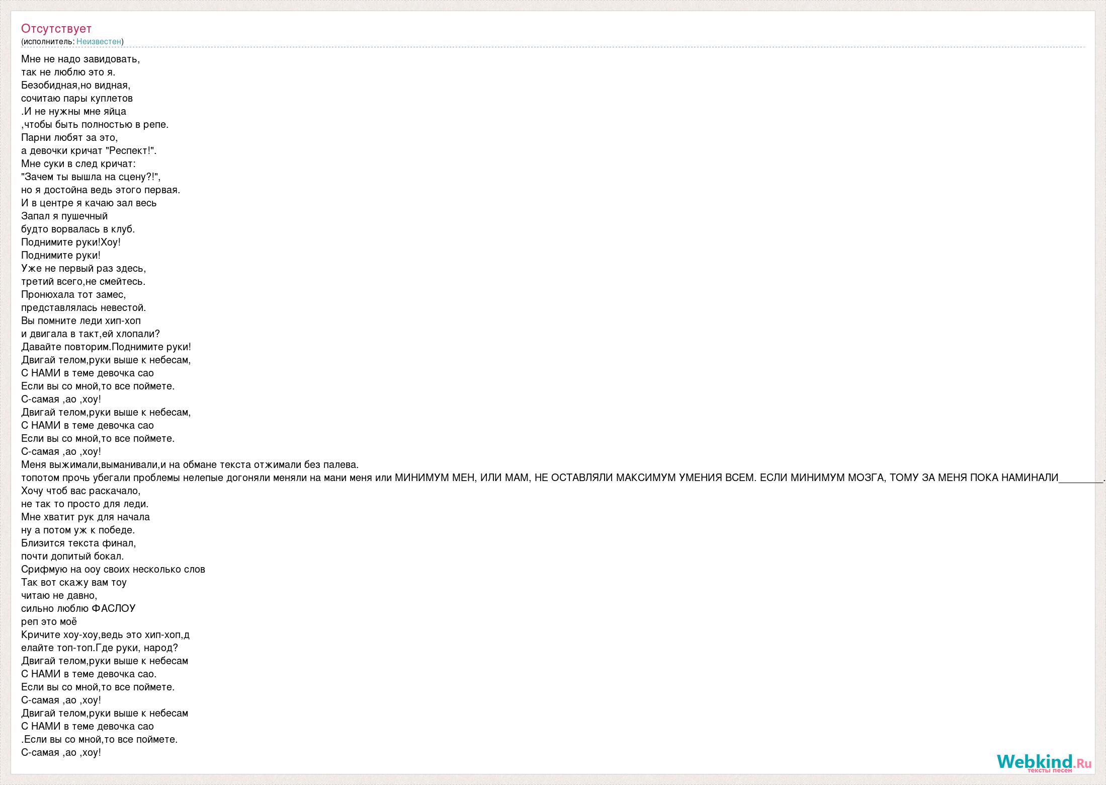 Мне не надо завидовать, так не люблю это я. Безобидная,но видная, сочитаю пары куплетов .И не нужны мне яйца ,чтобы быть полностью в репе. Парни любят за это, а девочки кричат "Респект!". Мне суки в след кричат: "Зачем ты вышла на сцену?!", но я достойна ведь этого первая. И в центре я качаю зал весь Запал я пушечный будто ворвалась в клуб. Поднимите руки!Хоу! Поднимите руки! Уже не первый раз здесь, третий всего,не смейтесь. Пронюхала тот замес, представлялась невестой. Вы помните леди хип-хоп и двигала в такт,ей хлопали? Давайте повторим.Поднимите руки! Двигай телом,руки выше к небесам, С НАМИ в теме девочка сао Если вы со мной,то все поймете. С-самая ,ао ,хоу! Двигай телом,руки выше к небесам, С НАМИ в теме девочка сао Если вы со мной,то все поймете. С-самая ,ао ,хоу! Меня выжимали,выманивали,и на обмане текста отжимали без палева. топотом прочь убегали проблемы нелепые догоняли меняли на мани меня или МИНИМУМ МЕН, ИЛИ МАМ, НЕ ОСТАВЛЯЛИ МАКСИМУМ УМЕНИЯ ВСЕМ. ЕСЛИ МИНИМУМ МОЗГА, ТОМУ ЗА МЕНЯ ПОКА НАМИНАЛИ________. Хочу чтоб вас раскачало, не так то просто для леди. Мне хватит рук для начала ну а потом уж к победе. Близится текста финал, почти допитый бокал. Срифмую на ооу своих несколько слов Так вот скажу вам тоу читаю не давно, сильно люблю ФАСЛОУ реп это моё Кричите хоу-хоу,ведь это хип-хоп,д елайте топ-топ.Где руки, народ? Двигай телом,руки выше к небесам С НАМИ в теме девочка сао. Если вы со мной,то все поймете. С-самая ,ао ,хоу! Двигай телом,руки выше к небесам С НАМИ в теме девочка сао .Если вы со мной,то все поймете. С-самая ,ао ,хоу!