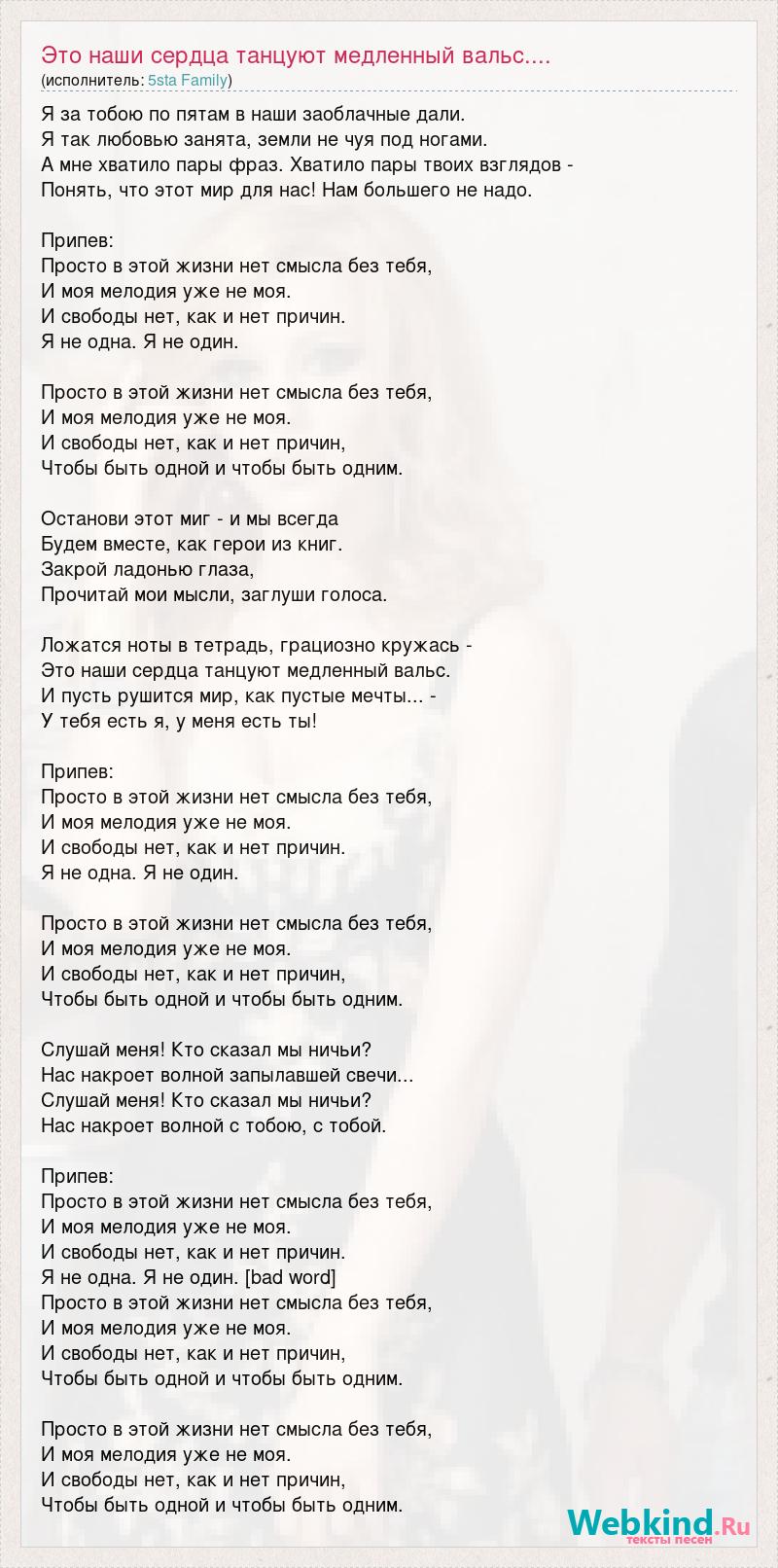 Я за тобою по пятам в наши заоблачные дали. Я так любовью занята, земли не чуя под ногами. А мне хватило пары фраз. Хватило пары твоих взглядов - Понять, что этот мир для нас! Нам большего не надо. Припев: Просто в этой жизни нет смысла без тебя, И моя мелодия уже не моя. И свободы нет, как и нет причин. Я не одна. Я не один. Просто в этой жизни нет смысла без тебя, И моя мелодия уже не моя. И свободы нет, как и нет причин, Чтобы быть одной и чтобы быть одним. Останови этот миг - и мы всегда Будем вместе, как герои из книг. Закрой ладонью глаза, Прочитай мои мысли, заглуши голоса. Ложатся ноты в тетрадь, грациозно кружась - Это наши сердца танцуют медленный вальс. И пусть рушится мир, как пустые мечты... - У тебя есть я, у меня есть ты! Припев: Просто в этой жизни нет смысла без тебя, И моя мелодия уже не моя. И свободы нет, как и нет причин. Я не одна. Я не один. Просто в этой жизни нет смысла без тебя, И моя мелодия уже не моя. И свободы нет, как и нет причин, Чтобы быть одной и чтобы быть одним. Слушай меня! Кто сказал мы ничьи? Нас накроет волной запылавшей свечи... Слушай меня! Кто сказал мы ничьи? Нас накроет волной с тобою, с тобой. Припев: Просто в этой жизни нет смысла без тебя, И моя мелодия уже не моя. И свободы нет, как и нет причин. Я не одна. Я не один. [bad word] Просто в этой жизни нет смысла без тебя, И моя мелодия уже не моя. И свободы нет, как и нет причин, Чтобы быть одной и чтобы быть одним. Просто в этой жизни нет смысла без тебя, И моя мелодия уже не моя. И свободы нет, как и нет причин, Чтобы быть одной и чтобы быть одним.