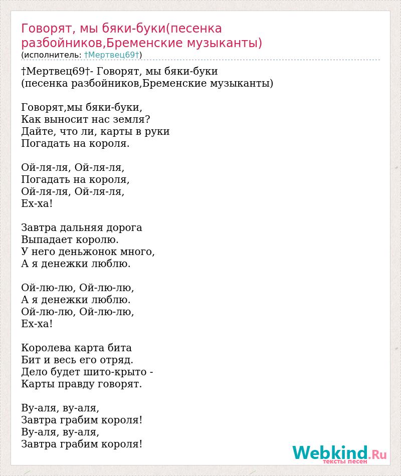 †Мертвец69†- Говорят, мы бяки-буки (песенка разбойников,Бременские музыканты) Говорят,мы бяки-буки, Как выносит нас земля? Дайте, что ли, карты в руки Погадать на короля. Ой-ля-ля, Ой-ля-ля, Погадать на короля, Ой-ля-ля, Ой-ля-ля, Ех-ха! Завтра дальняя дорога Выпадает королю. У него деньжонок много, А я денежки люблю. Ой-лю-лю, Ой-лю-лю, А я денежки люблю. Ой-лю-лю, Ой-лю-лю, Ех-ха! Королева карта бита Бит и весь его отряд. Дело будет шито-крыто - Карты правду говорят. Ву-аля, ву-аля, Завтра грабим короля! Ву-аля, ву-аля, Завтра грабим короля!