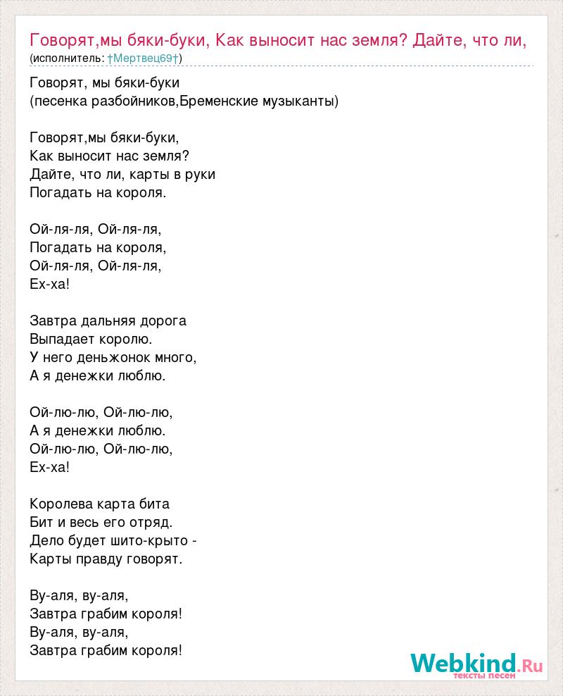 Говорят, мы бяки-буки (песенка разбойников,Бременские музыканты) Говорят,мы бяки-буки, Как выносит нас земля? Дайте, что ли, карты в руки Погадать на короля. Ой-ля-ля, Ой-ля-ля, Погадать на короля, Ой-ля-ля, Ой-ля-ля, Ех-ха! Завтра дальняя дорога Выпадает королю. У него деньжонок много, А я денежки люблю. Ой-лю-лю, Ой-лю-лю, А я денежки люблю. Ой-лю-лю, Ой-лю-лю, Ех-ха! Королева карта бита Бит и весь его отряд. Дело будет шито-крыто - Карты правду говорят. Ву-аля, ву-аля, Завтра грабим короля! Ву-аля, ву-аля, Завтра грабим короля!
