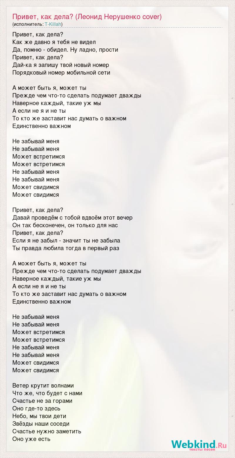 Привет, как дела? Как же давно я тебя не видел Да, помню - обидел. Ну ладно, прости Привет, как дела? Дай-ка я запишу твой новый номер Порядковый номер мобильной сети А может быть я, может ты Прежде чем что-то сделать подумает дважды Наверное каждый, такие уж мы А если не я и не ты То кто же заставит нас думать о важном Единственно важном Не забывай меня Не забывай меня Может встретимся Может встретимся Не забывай меня Не забывай меня Может свидимся Может свидимся Привет, как дела? Давай проведём с тобой вдвоём этот вечер Он так бесконечен, он только для нас Привет, как дела? Если я не забыл - значит ты не забыла Ты правда любила тогда в первый раз А может быть я, может ты Прежде чем что-то сделать подумает дважды Наверное каждый, такие уж мы А если не я и не ты То кто же заставит нас думать о важном Единственно важном Не забывай меня Не забывай меня Может встретимся Может встретимся Не забывай меня Не забывай меня Может свидимся Может свидимся Ветер крутит волнами Что же, что будет с нами Счастье не за горами Оно где-то здесь Небо, мы твои дети Звёзды наши соседи Счастье нужно заметить Оно уже есть