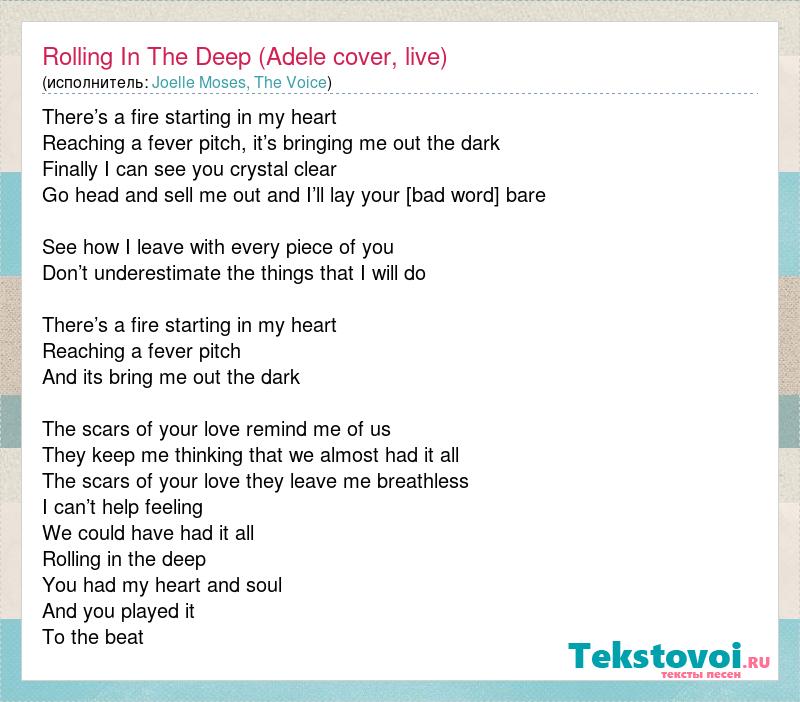There’s a fire starting in my heart Reaching a fever pitch, it’s bringing me out the dark Finally I can see you crystal clear Go head and sell me out and I’ll lay your [bad word] bare See how I leave with every piece of you Don’t underestimate the things that I will do There’s a fire starting in my heart Reaching a fever pitch And its bring me out the dark The scars of your love remind me of us They keep me thinking that we almost had it all The scars of your love they leave me breathless I can’t help feeling We could have had it all Rolling in the deep You had my heart and soul And you played it To the beat