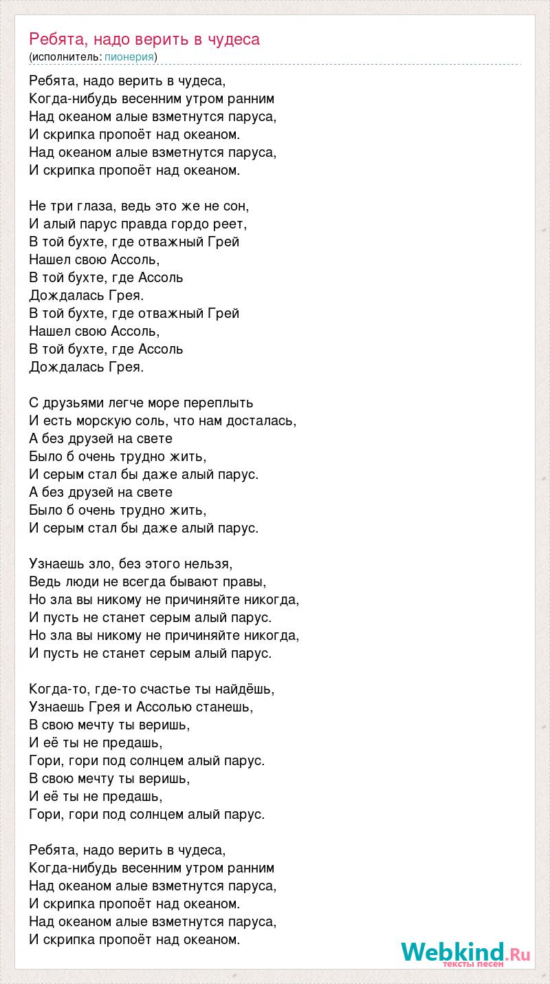 Ребята, надо верить в чудеса, Когда-нибудь весенним утром ранним Над океаном алые взметнутся паруса, И скрипка пропоёт над океаном. Над океаном алые взметнутся паруса, И скрипка пропоёт над океаном. Не три глаза, ведь это же не сон, И алый парус правда гордо реет, В той бухте, где отважный Грей Нашел свою Ассоль, В той бухте, где Ассоль Дождалась Грея. В той бухте, где отважный Грей Нашел свою Ассоль, В той бухте, где Ассоль Дождалась Грея. С друзьями легче море переплыть И есть морскую соль, что нам досталась, А без друзей на свете Было б очень трудно жить, И серым стал бы даже алый парус. А без друзей на свете Было б очень трудно жить, И серым стал бы даже алый парус. Узнаешь зло, без этого нельзя, Ведь люди не всегда бывают правы, Но зла вы никому не причиняйте никогда, И пусть не станет серым алый парус. Но зла вы никому не причиняйте никогда, И пусть не станет серым алый парус. Когда-то, где-то счастье ты найдёшь, Узнаешь Грея и Ассолью станешь, В свою мечту ты веришь, И её ты не предашь, Гори, гори под солнцем алый парус. В свою мечту ты веришь, И её ты не предашь, Гори, гори под солнцем алый парус. Ребята, надо верить в чудеса, Когда-нибудь весенним утром ранним Над океаном алые взметнутся паруса, И скрипка пропоёт над океаном. Над океаном алые взметнутся паруса, И скрипка пропоёт над океаном.