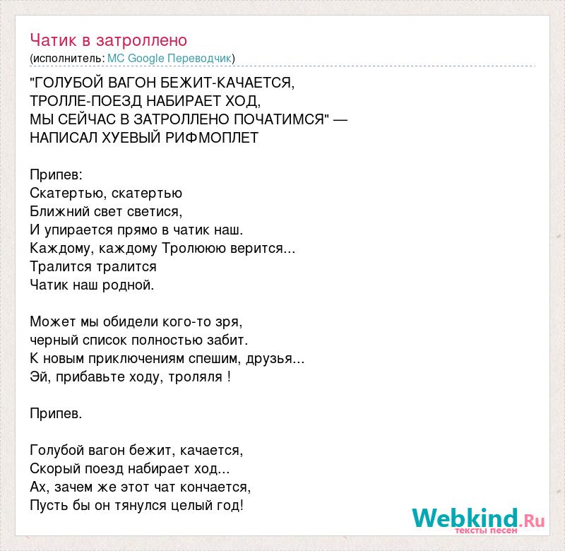 "ГОЛУБОЙ ВАГОН БЕЖИТ-КАЧАЕТСЯ, ТРОЛЛЕ-ПОЕЗД НАБИРАЕТ ХОД, МЫ СЕЙЧАС В ЗАТРОЛЛЕНО ПОЧАТИМСЯ" — НАПИСАЛ ХУЕВЫЙ РИФМОПЛЕТ Припев: Скатертью, скатертью Ближний свет светися, И упирается прямо в чатик наш. Каждому, каждому Тролююю верится... Тралится тралится Чатик наш родной. Может мы обидели кого-то зря, черный список полностью забит. К новым приключениям спешим, друзья... Эй, прибавьте ходу, троляля ! Припев. Голубой вагон бежит, качается, Скорый поезд набирает ход... Ах, зачем же этот чат кончается, Пусть бы он тянулся целый год!