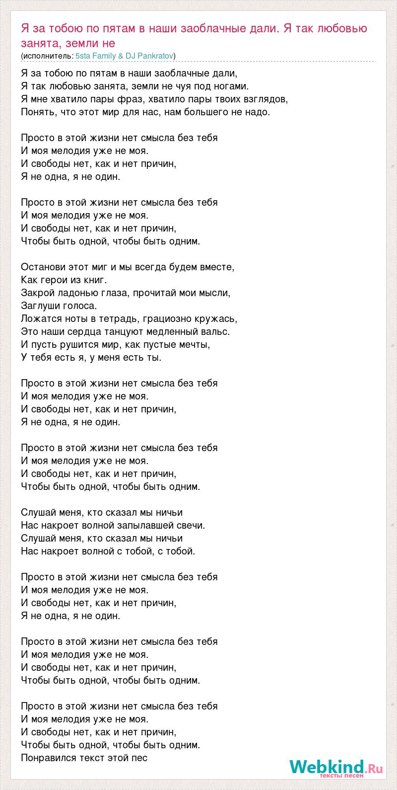 Я за тобою по пятам в наши заоблачные дали, Я так любовью занята, земли не чуя под ногами. Я мне хватило пары фраз, хватило пары твоих взглядов, Понять, что этот мир для нас, нам большего не надо. Просто в этой жизни нет смысла без тебя И моя мелодия уже не моя. И свободы нет, как и нет причин, Я не одна, я не один. Просто в этой жизни нет смысла без тебя И моя мелодия уже не моя. И свободы нет, как и нет причин, Чтобы быть одной, чтобы быть одним. Останови этот миг и мы всегда будем вместе, Как герои из книг. Закрой ладонью глаза, прочитай мои мысли, Заглуши голоса. Ложатся ноты в тетрадь, грациозно кружась, Это наши сердца танцуют медленный вальс. И пусть рушится мир, как пустые мечты, У тебя есть я, у меня есть ты. Просто в этой жизни нет смысла без тебя И моя мелодия уже не моя. И свободы нет, как и нет причин, Я не одна, я не один. Просто в этой жизни нет смысла без тебя И моя мелодия уже не моя. И свободы нет, как и нет причин, Чтобы быть одной, чтобы быть одним. Слушай меня, кто сказал мы ничьи Нас накроет волной запылавшей свечи. Слушай меня, кто сказал мы ничьи Нас накроет волной с тобой, с тобой. Просто в этой жизни нет смысла без тебя И моя мелодия уже не моя. И свободы нет, как и нет причин, Я не одна, я не один. Просто в этой жизни нет смысла без тебя И моя мелодия уже не моя. И свободы нет, как и нет причин, Чтобы быть одной, чтобы быть одним. Просто в этой жизни нет смысла без тебя И моя мелодия уже не моя. И свободы нет, как и нет причин, Чтобы быть одной, чтобы быть одним. Понравился текст этой пес