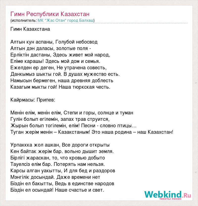 Гимн Казахстана Алтын кун аспаны, Голубой небосвод Алтын дэн даласы, золотые поля - Ерлiктiн дастаны, Здесь живет мой народ, Елiме карашы! Здесь мой дом и семья. Ежелден ер деген, Не утрачена совесть, Данкымыз шыкты гой. В душах мужество есть. Намысын бермеген, наша древняя доблесть Казагым мыкты гой! Наша тюркская честь. Кайрмасы: Припев: Менiн елiм, менiн елiм, Степи и горы, солнце и туман Гулiн болып егiлемiн, запах трав струится, Жырын болып тогiлемiн, елiм! Песни - словно птицы… Туган жерiм менiн – Казакстаным! Это наша родина – наш Казахстан! Урпаккка жол ашкан, Все дороги открыты Кен байтак жерiм бар. вольно дышит земля. Бiрлiгi жараскан, то, что кровью добыто Тауелсiз елiм бар. Потерять нам нельзя. Карсы алган уакытты, И для бед и раздоров Мэнгiлiк досындай. Даже времени нет Бiздiн ел бакытты, Ведь в единстве народов Бiздiн ел осындай! Наше счастье и свет.