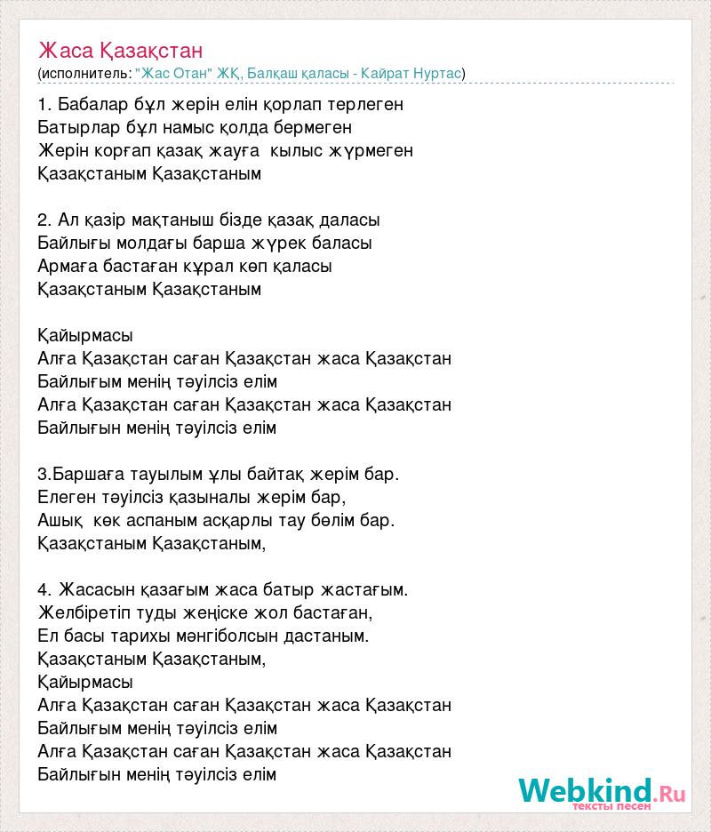 1. Бабалар бұл жерін елін қорлап терлеген Батырлар бұл намыс қолда бермеген Жерін корғап қазақ жауға кылыс жүрмеген Қазақстаным Қазақстаным 2. Ал қазір мақтаныш бізде қазақ даласы Байлығы молдағы барша жүрек баласы Армаға бастаған кұрал көп қаласы Қазақстаным Қазақстаным Қайырмасы Алға Қазақстан саған Қазақстан жаса Қазақстан Байлығым менің тәуілсіз елім Алға Қазақстан саған Қазақстан жаса Қазақстан Байлығын менің тәуілсіз елім 3.Баршаға тауылым ұлы байтақ жерім бар. Елеген тәуілсіз қазыналы жерім бар, Ашық көк аспаным асқарлы тау бөлім бар. Қазақстаным Қазақстаным, 4. Жасасын қазағым жаса батыр жастағым. Желбіретіп туды жеңіске жол бастаған, Ел басы тарихы мәнгіболсын дастаным. Қазақстаным Қазақстаным, Қайырмасы Алға Қазақстан саған Қазақстан жаса Қазақстан Байлығым менің тәуілсіз елім Алға Қазақстан саған Қазақстан жаса Қазақстан Байлығын менің тәуілсіз елім