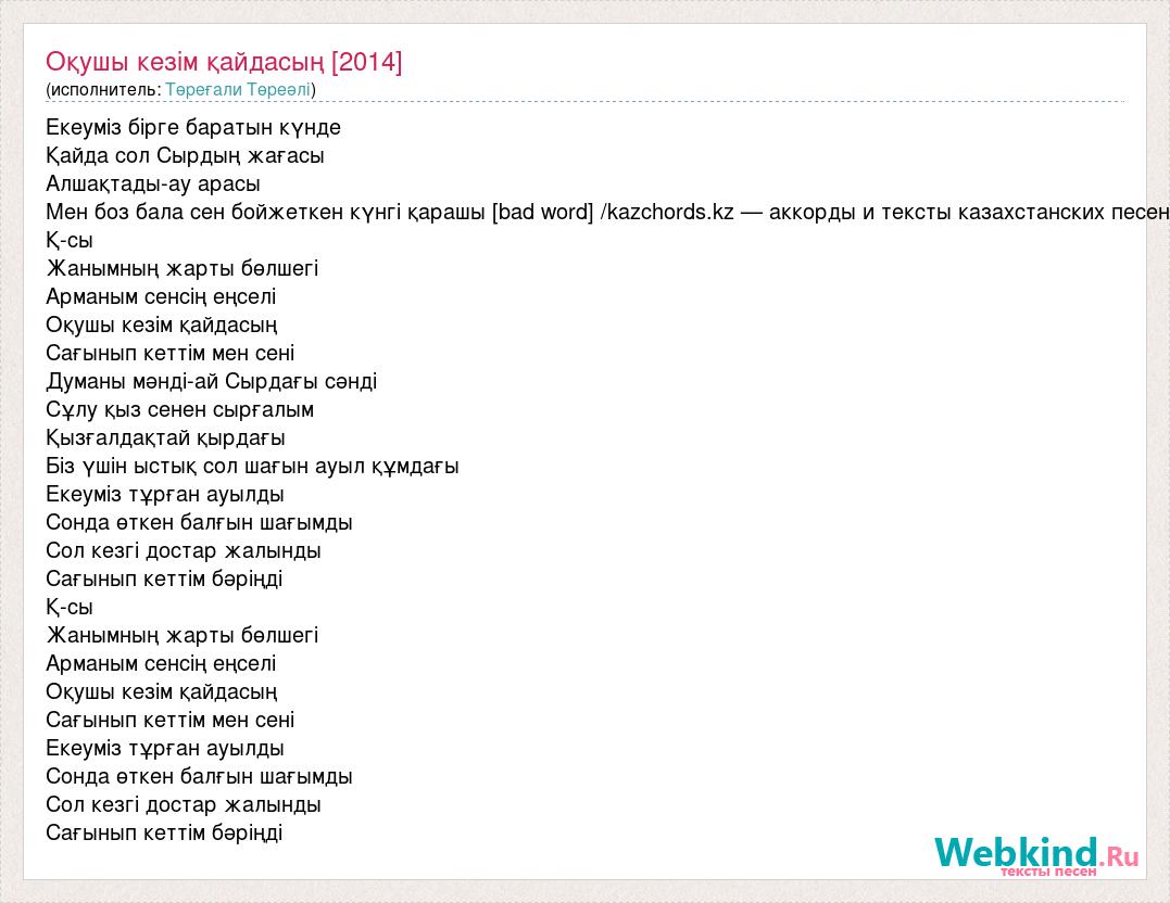 Екеуміз бірге баратын күнде Қайда сол Сырдың жағасы Алшақтады-ау арасы Мен боз бала сен бойжеткен күнгі қарашы [bad word] /kazchords.kz — аккорды и тексты казахстанских песен Қ-сы Жанымның жарты бөлшегі Арманым сенсің еңселі Оқушы кезім қайдасың Сағынып кеттім мен сені Думаны мәнді-ай Сырдағы сәнді Сұлу қыз сенен сырғалым Қызғалдақтай қырдағы Біз үшін ыстық сол шағын ауыл құмдағы Екеуміз тұрған ауылды Сонда өткен балғын шағымды Сол кезгі достар жалынды Сағынып кеттім бәріңді Қ-сы Жанымның жарты бөлшегі Арманым сенсің еңселі Оқушы кезім қайдасың Сағынып кеттім мен сені Екеуміз тұрған ауылды Сонда өткен балғын шағымды Сол кезгі достар жалынды Сағынып кеттім бәріңді