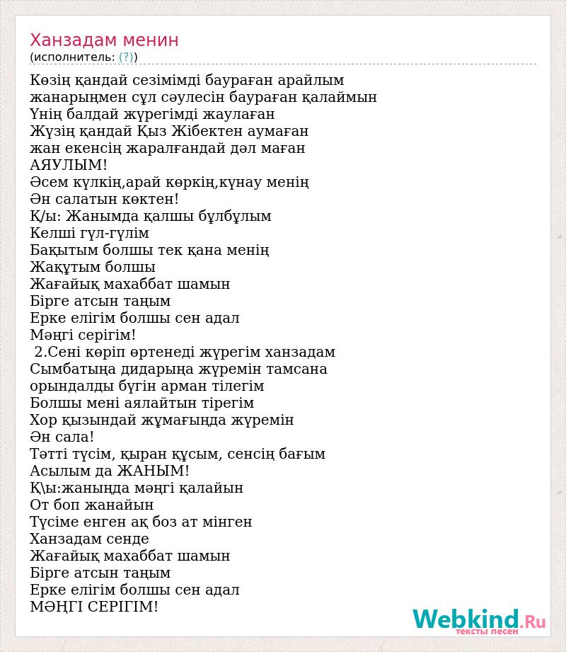 А как ты думаешь, о чем песня "Ханзадам менин " ?
