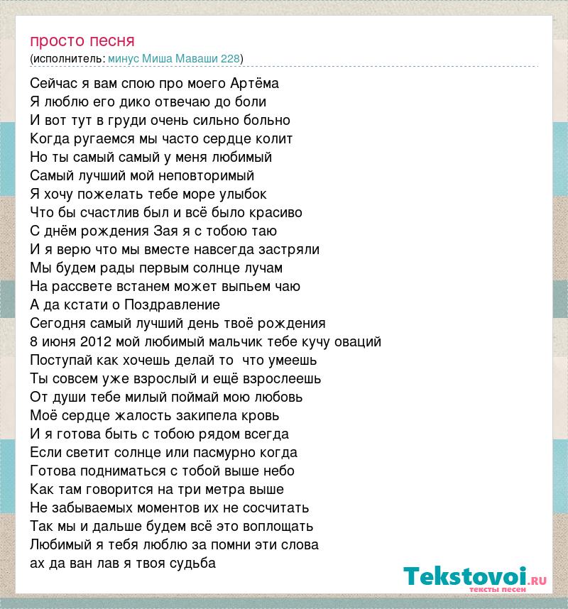 Сейчас я вам спою про моего Артёма Я люблю его дико отвечаю до боли И вот тут в груди очень сильно больно Когда ругаемся мы часто сердце колит Но ты самый самый у меня любимый Самый лучший мой неповторимый Я хочу пожелать тебе море улыбок Что бы счастлив был и всё было красиво С днём рождения Зая я с тобою таю И я верю что мы вместе навсегда застряли Мы будем рады первым солнце лучам На рассвете встанем может выпьем чаю А да кстати о Поздравление Сегодня самый лучший день твоё рождения 8 июня 2012 мой любимый мальчик тебе кучу оваций Поступай как хочешь делай то что умеешь Ты совсем уже взрослый и ещё взрослеешь От души тебе милый поймай мою любовь Моё сердце жалость закипела кровь И я готова быть с тобою рядом всегда Если светит солнце или пасмурно когда Готова подниматься с тобой выше небо Как там говорится на три метра выше Не забываемых моментов их не сосчитать Так мы и дальше будем всё это воплощать Любимый я тебя люблю за помни эти слова ах да ван лав я твоя судьба