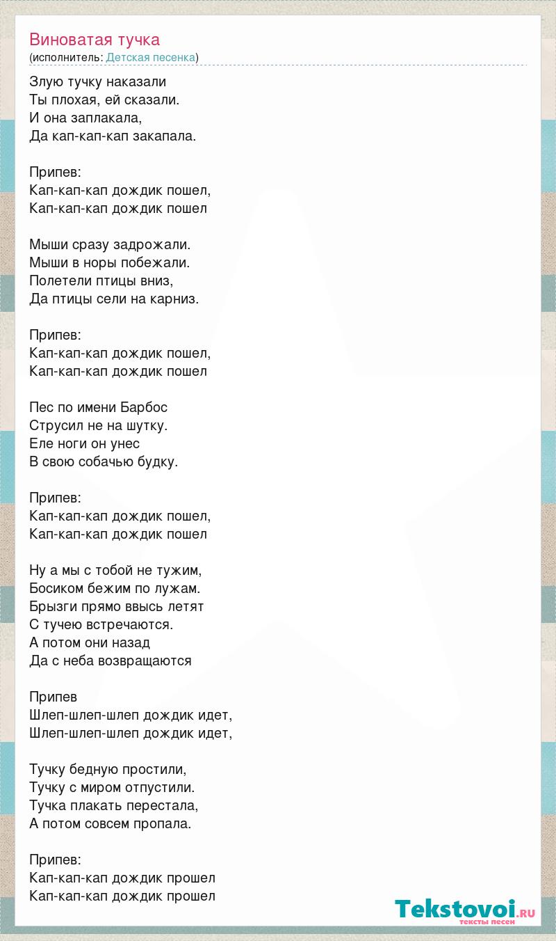 Злую тучку наказали Ты плохая, ей сказали. И она заплакала, Да кап-кап-кап закапала. Припев: Кап-кап-кап дождик пошел, Кап-кап-кап дождик пошел Мыши сразу задрожали. Мыши в норы побежали. Полетели птицы вниз, Да птицы сели на карниз. Припев: Кап-кап-кап дождик пошел, Кап-кап-кап дождик пошел Пес по имени Барбос Струсил не на шутку. Еле ноги он унес В свою собачью будку. Припев: Кап-кап-кап дождик пошел, Кап-кап-кап дождик пошел Ну а мы с тобой не тужим, Босиком бежим по лужам. Брызги прямо ввысь летят С тучею встречаются. А потом они назад Да с неба возвращаются Припев Шлеп-шлеп-шлеп дождик идет, Шлеп-шлеп-шлеп дождик идет, Тучку бедную простили, Тучку с миром отпустили. Тучка плакать перестала, А потом совсем пропала. Припев: Кап-кап-кап дождик прошел Кап-кап-кап дождик прошел