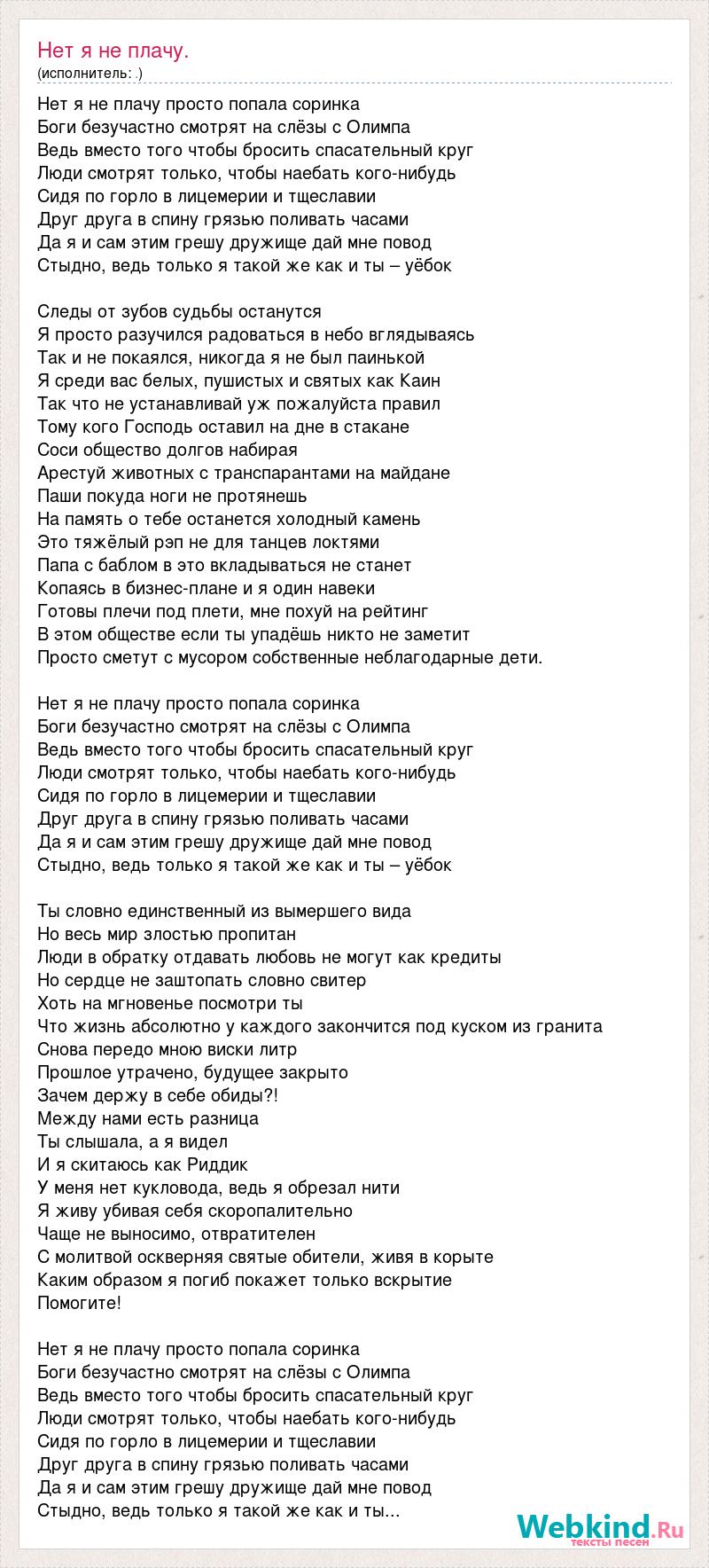Нет я не плачу просто попала соринка Боги безучастно смотрят на слёзы с Олимпа Ведь вместо того чтобы бросить спасательный круг Люди смотрят только, чтобы наебать кого-нибудь Сидя по горло в лицемерии и тщеславии Друг друга в спину грязью поливать часами Да я и сам этим грешу дружище дай мне повод Стыдно, ведь только я такой же как и ты – уёбок Следы от зубов судьбы останутся Я просто разучился радоваться в небо вглядываясь Так и не покаялся, никогда я не был паинькой Я среди вас белых, пушистых и святых как Каин Так что не устанавливай уж пожалуйста правил Тому кого Господь оставил на дне в стакане Соси общество долгов набирая Арестуй животных с транспарантами на майдане Паши покуда ноги не протянешь На память о тебе останется холодный камень Это тяжёлый рэп не для танцев локтями Папа с баблом в это вкладываться не станет Копаясь в бизнес-плане и я один навеки Готовы плечи под плети, мне похуй на рейтинг В этом обществе если ты упадёшь никто не заметит Просто сметут с мусором собственные неблагодарные дети. Нет я не плачу просто попала соринка Боги безучастно смотрят на слёзы с Олимпа Ведь вместо того чтобы бросить спасательный круг Люди смотрят только, чтобы наебать кого-нибудь Сидя по горло в лицемерии и тщеславии Друг друга в спину грязью поливать часами Да я и сам этим грешу дружище дай мне повод Стыдно, ведь только я такой же как и ты – уёбок Ты словно единственный из вымершего вида Но весь мир злостью пропитан Люди в обратку отдавать любовь не могут как кредиты Но сердце не заштопать словно свитер Хоть на мгновенье посмотри ты Что жизнь абсолютно у каждого закончится под куском из гранита Снова передо мною виски литр Прошлое утрачено, будущее закрыто Зачем держу в себе обиды?! Между нами есть разница Ты слышала, а я видел И я скитаюсь как Риддик У меня нет кукловода, ведь я обрезал нити Я живу убивая себя скоропалительно Чаще не выносимо, отвратителен С молитвой оскверняя святые обители, живя в корыте Каким образом я погиб покажет только вскрытие Помогите! Нет я не плачу просто попала соринка Боги безучастно смотрят на слёзы с Олимпа Ведь вместо того чтобы бросить спасательный круг Люди смотрят только, чтобы наебать кого-нибудь Сидя по горло в лицемерии и тщеславии Друг друга в спину грязью поливать часами Да я и сам этим грешу дружище дай мне повод Стыдно, ведь только я такой же как и ты...