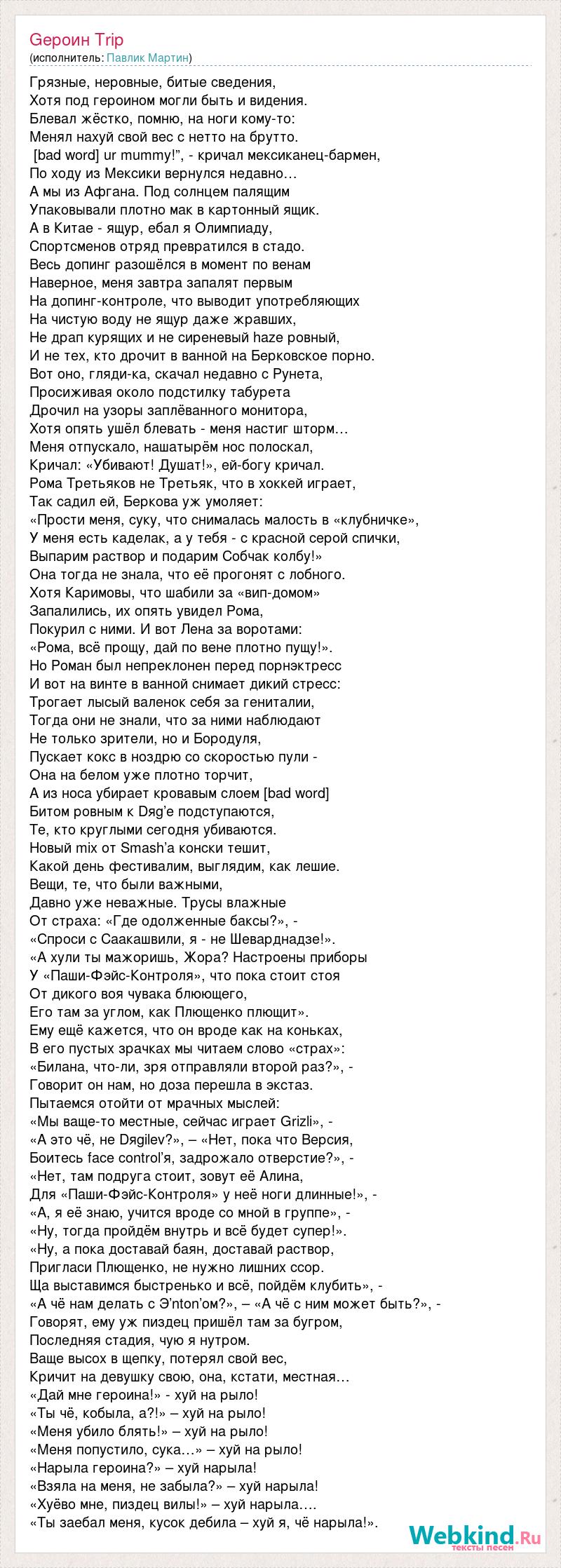 Грязные, неровные, битые сведения, Хотя под героином могли быть и видения. Блевал жёстко, помню, на ноги кому-то: Менял нахуй свой вес с нетто на брутто. [bad word] ur mummy!”, - кричал мексиканец-бармен, По ходу из Мексики вернулся недавно… А мы из Афгана. Под солнцем палящим Упаковывали плотно мак в картонный ящик. А в Китае - ящур, ебал я Олимпиаду, Спортсменов отряд превратился в стадо. Весь допинг разошёлся в момент по венам Наверное, меня завтра запалят первым На допинг-контроле, что выводит употребляющих На чистую воду не ящур даже жравших, Не драп курящих и не сиреневый haze ровный, И не тех, кто дрочит в ванной на Берковское порно. Вот оно, гляди-ка, скачал недавно с Рунета, Просиживая около подстилку табурета Дрочил на узоры заплёванного монитора, Хотя опять ушёл блевать - меня настиг шторм… Меня отпускало, нашатырём нос полоскал, Кричал: «Убивают! Душат!», ей-богу кричал. Рома Третьяков не Третьяк, что в хоккей играет, Так садил ей, Беркова уж умоляет: «Прости меня, суку, что снималась малость в «клубничке», У меня есть каделак, а у тебя - с красной серой спички, Выпарим раствор и подарим Собчак колбу!» Она тогда не знала, что её прогонят с лобного. Хотя Каримовы, что шабили за «вип-домом» Запалились, их опять увидел Рома, Покурил с ними. И вот Лена за воротами: «Рома, всё прощу, дай по вене плотно пущу!». Но Роман был непреклонен перед порнэктресс И вот на винте в ванной снимает дикий стресс: Трогает лысый валенок себя за гениталии, Тогда они не знали, что за ними наблюдают Не только зрители, но и Бородуля, Пускает кокс в ноздрю со скоростью пули - Она на белом уже плотно торчит, А из носа убирает кровавым слоем [bad word] Битом ровным к Dяg’е подступаются, Те, кто круглыми сегодня убиваются. Новый mix от Smash’а конски тешит, Какой день фестивалим, выглядим, как лешие. Вещи, те, что были важными, Давно уже неважные. Трусы влажные От страха: «Где одолженные баксы?», - «Спроси с Саакашвили, я - не Шеварднадзе!». «А хули ты мажоришь, Жора? Настроены приборы У «Паши-Фэйс-Контроля», что пока стоит стоя От дикого воя чувака блюющего, Его там за углом, как Плющенко плющит». Ему ещё кажется, что он вроде как на коньках, В его пустых зрачках мы читаем слово «страх»: «Билана, что-ли, зря отправляли второй раз?», - Говорит он нам, но доза перешла в экстаз. Пытаемся отойти от мрачных мыслей: «Мы ваще-то местные, сейчас играет Grizli», - «А это чё, не Dяgilev?», – «Нет, пока что Версия, Боитесь face control’я, задрожало отверстие?», - «Нет, там подруга стоит, зовут её Алина, Для «Паши-Фэйс-Контроля» у неё ноги длинные!», - «А, я её знаю, учится вроде со мной в группе», - «Ну, тогда пройдём внутрь и всё будет супер!». «Ну, а пока доставай баян, доставай раствор, Пригласи Плющенко, не нужно лишних ссор. Ща выставимся быстренько и всё, пойдём клубить», - «А чё нам делать с Э’nton’ом?», – «А чё с ним может быть?», - Говорят, ему уж пиздец пришёл там за бугром, Последняя стадия, чую я нутром. Ваще высох в щепку, потерял свой вес, Кричит на девушку свою, она, кстати, местная… «Дай мне героина!» - хуй на рыло! «Ты чё, кобыла, а?!» – хуй на рыло! «Меня убило блять!» – хуй на рыло! «Меня попустило, сука…» – хуй на рыло! «Нарыла героина?» – хуй нарыла! «Взяла на меня, не забыла?» – хуй нарыла! «Хуёво мне, пиздец вилы!» – хуй нарыла…. «Ты заебал меня, кусок дебила – хуй я, чё нарыла!».