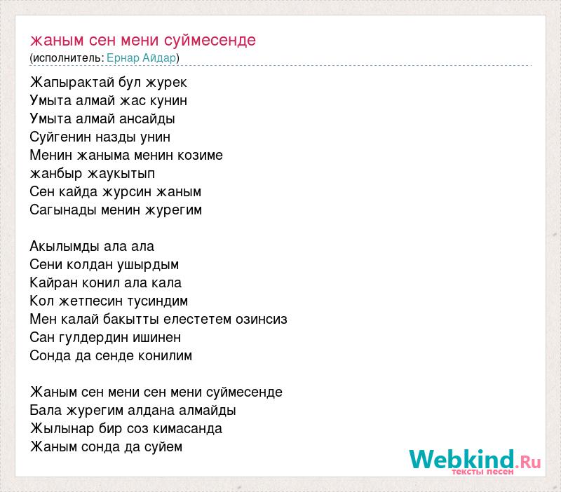 Жапырактай бул журек Умыта алмай жас кунин Умыта алмай ансайды Суйгенин назды унин Менин жаныма менин козиме жанбыр жаукытып Сен кайда журсин жаным Сагынады менин журегим Акылымды ала ала Сени колдан ушырдым Кайран конил ала кала Кол жетпесин тусиндим Мен калай бакытты елестетем озинсиз Сан гулдердин ишинен Сонда да сенде конилим Жаным сен мени сен мени суймесенде Бала журегим алдана алмайды Жылынар бир соз кимасанда Жаным сонда да суйем