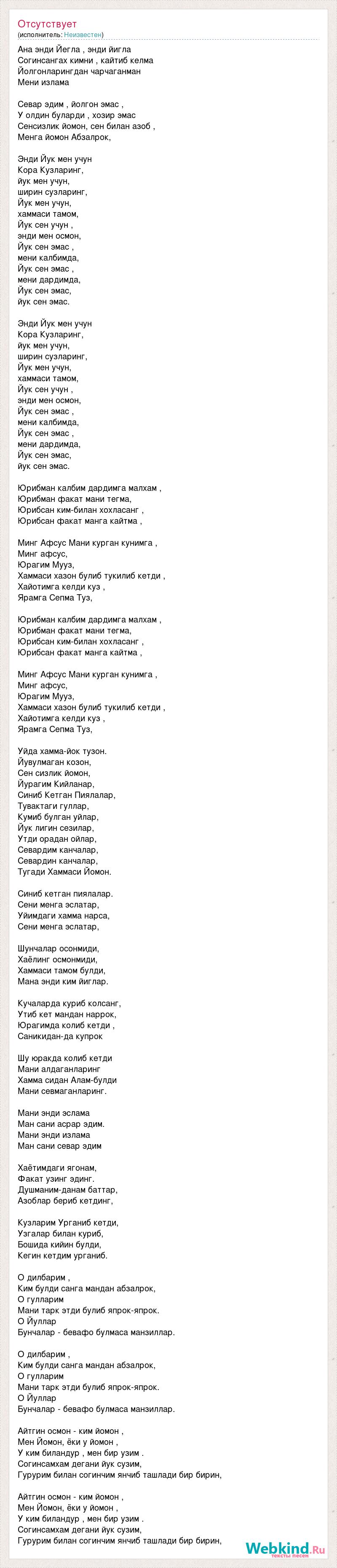 Ана энди Йегла , энди йигла Согинсангах кимни , кайтиб келма Йолгонларингдан чарчаганман Мени излама Севар эдим , йолгон эмас , У олдин буларди , хозир эмас Сенсизлик йомон, сен билан азоб , Менга йомон Абзалрок, Энди Йук мен учун Кора Кузларинг, йук мен учун, ширин сузларинг, Йук мен учун, хаммаси тамом, Йук сен учун , энди мен осмон, Йук сен эмас , мени калбимда, Йук сен эмас , мени дардимда, Йук сен эмас, йук сен эмас. Энди Йук мен учун Кора Кузларинг, йук мен учун, ширин сузларинг, Йук мен учун, хаммаси тамом, Йук сен учун , энди мен осмон, Йук сен эмас , мени калбимда, Йук сен эмас , мени дардимда, Йук сен эмас, йук сен эмас. Юрибман калбим дардимга малхам , Юрибман факат мани тегма, Юрибсан ким-билан хохласанг , Юрибсан факат манга кайтма , Минг Афсус Мани курган кунимга , Минг афсус, Юрагим Мууз, Хаммаси хазон булиб тукилиб кетди , Хайотимга келди куз , Ярамга Сепма Туз, Юрибман калбим дардимга малхам , Юрибман факат мани тегма, Юрибсан ким-билан хохласанг , Юрибсан факат манга кайтма , Минг Афсус Мани курган кунимга , Минг афсус, Юрагим Мууз, Хаммаси хазон булиб тукилиб кетди , Хайотимга келди куз , Ярамга Сепма Туз, Уйда хамма-йок тузон. Йувулмаган козон, Сен сизлик йомон, Йурагим Кийланар, Синиб Кетган Пиялалар, Тувактаги гуллар, Кумиб булган уйлар, Йук лигин сезилар, Утди орадан ойлар, Севардим канчалар, Севардин канчалар, Тугади Хаммаси Йомон. Синиб кетган пиялалар. Сени менга эслатар, Уйимдаги хамма нарса, Сени менга эслатар, Шунчалар осонмиди, Хаёлинг осмонмиди, Хаммаси тамом булди, Мана энди ким йиглар. Кучаларда куриб колсанг, Утиб кет мандан наррок, Юрагимда колиб кетди , Саникидан-да купрок Шу юракда колиб кетди Мани алдаганларинг Хамма сидан Алам-булди Мани севмаганларинг. Мани энди эслама Ман сани асрар эдим. Мани энди излама Ман сани севар эдим Хаётимдаги ягонам, Факат узинг эдинг. Душманим-данам баттар, Азоблар бериб кетдинг, Кузларим Урганиб кетди, Узгалар билан куриб, Бошида кийин булди, Кегин кетдим урганиб. О дилбарим , Ким булди санга мандан абзалрок, О гулларим Мани тарк этди булиб япрок-япрок. О Йуллар Бунчалар - бевафо булмаса манзиллар. О дилбарим , Ким булди санга мандан абзалрок, О гулларим Мани тарк этди булиб япрок-япрок. О Йуллар Бунчалар - бевафо булмаса манзиллар. Айтгин осмон - ким йомон , Мен Йомон, ёки у йомон , У ким биландур , мен бир узим . Согинсамхам дегани йук сузим, Гурурим билан согинчим янчиб ташлади бир бирин, Айтгин осмон - ким йомон , Мен Йомон, ёки у йомон , У ким биландур , мен бир узим . Согинсамхам дегани йук сузим, Гурурим билан согинчим янчиб ташлади бир бирин,