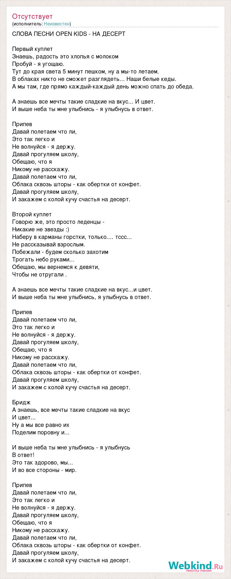 СЛОВА ПЕСНИ OPEN KIDS - НА ДЕСЕРТ Первый куплет Знаешь, радость это хлопья с молоком Пробуй - я угощаю. Тут до края света 5 минут пешком, ну а мы-то летаем. В облаках никто не сможет разглядеть... Наши белые кеды. А мы там, где прямо каждый-каждый день можно спать до обеда. А знаешь все мечты такие сладкие на вкус... И цвет. И выше неба ты мне улыбнись - я улыбнусь в ответ. Припев Давай полетаем что ли, Это так легко и Не волнуйся - я держу. Давай прогуляем школу, Обещаю, что я Никому не расскажу. Давай полетаем что ли, Облака сквозь шторы - как обертки от конфет. Давай прогуляем школу, И закажем с колой кучу счастья на десерт. Второй куплет Говорю же, это просто леденцы - Никакие не звезды :) Наберу в карманы горстки, только.... тссс... Не рассказывай взрослым. Побежали - будем сколько захотим Трогать небо руками... Обещаю, мы вернемся к девяти, Чтобы не отругали . А знаешь все мечты такие сладкие на вкус...и цвет. И выше неба ты мне улыбнись, я улыбнусь в ответ. Припев Давай полетаем что ли, Это так легко и Не волнуйся - я держу. Давай прогуляем школу, Обещаю, что я Никому не расскажу. Давай полетаем что ли, Облака сквозь шторы - как обертки от конфет. Давай прогуляем школу, И закажем с колой кучу счастья на десерт. Бридж А знаешь, все мечты такие сладкие на вкус И цвет... Ну а мы все равно их Поделим поровну и... И выше неба ты мне улыбнись - я улыбнусь В ответ! Это так здорово, мы... И во все стороны - мир. Припев Давай полетаем что ли, Это так легко и Не волнуйся - я держу. Давай прогуляем школу, Обещаю, что я Никому не расскажу. Давай полетаем что ли, Облака сквозь шторы - как обертки от конфет. Давай прогуляем школу, И закажем с колой кучу счастья на десерт.