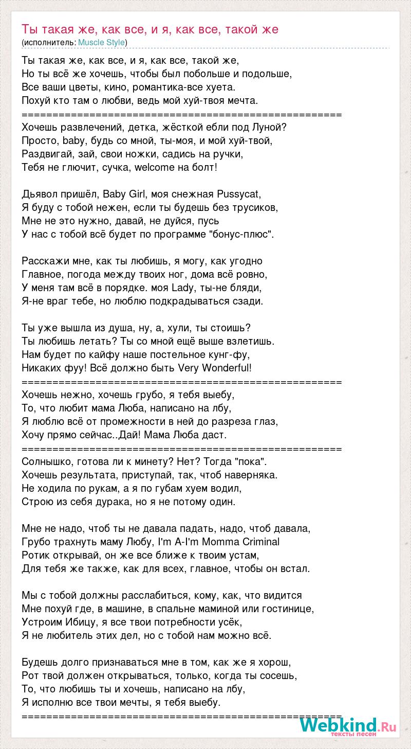 Ты такая же, как все, и я, как все, такой же, Но ты всё же хочешь, чтобы был побольше и подольше, Все ваши цветы, кино, романтика-все хуета. Похуй кто там о любви, ведь мой хуй-твоя мечта. ==================================================== Хочешь развлечений, детка, жёсткой ебли под Луной? Просто, baby, будь со мной, ты-моя, и мой хуй-твой, Раздвигай, зай, свои ножки, садись на ручки, Тебя не глючит, сучка, welcome на болт! Дьявол пришёл, Baby Girl, моя снежная Pussycat, Я буду с тобой нежен, если ты будешь без трусиков, Мне не это нужно, давай, не дуйся, пусь У нас с тобой всё будет по программе "бонус-плюс". Расскажи мне, как ты любишь, я могу, как угодно Главное, погода между твоих ног, дома всё ровно, У меня там всё в порядке. моя Lady, ты-не бляди, Я-не враг тебе, но люблю подкрадываться сзади. Ты уже вышла из душа, ну, а, хули, ты стоишь? Ты любишь летать? Ты со мной ещё выше взлетишь. Нам будет по кайфу наше постельное кунг-фу, Никаких фуу! Всё должно быть Very Wonderful! ==================================================== Хочешь нежно, хочешь грубо, я тебя выебу, То, что любит мама Люба, написано на лбу, Я люблю всё от промежности в ней до разреза глаз, Хочу прямо сейчас..Дай! Мама Люба даст. ==================================================== Солнышко, готова ли к минету? Нет? Тогда "пока". Хочешь результата, приступай, так, чтоб наверняка. Не ходила по рукам, а я по губам хуем водил, Строю из себя дурака, но я не потому один. Мне не надо, чтоб ты не давала падать, надо, чтоб давала, Грубо трахнуть маму Любу, I'm A-I'm Momma Criminal Ротик открывай, он же все ближе к твоим устам, Для тебя же также, как для всех, главное, чтобы он встал. Мы с тобой должны расслабиться, кому, как, что видится Мне похуй где, в машине, в спальне маминой или гостинице, Устроим Ибицу, я все твои потребности усёк, Я не любитель этих дел, но с тобой нам можно всё. Будешь долго признаваться мне в том, как же я хорош, Рот твой должен открываться, только, когда ты сосешь, То, что любишь ты и хочешь, написано на лбу, Я исполню все твои мечты, я тебя выебу. ====================================================