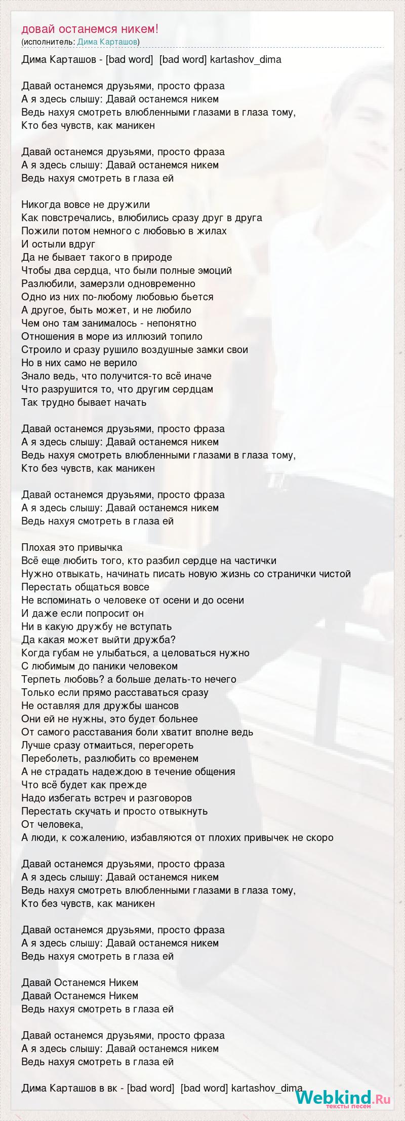 Дима Карташов - [bad word] [bad word] kartashov_dima Давай останемся друзьями, просто фраза А я здесь слышу: Давай останемся никем Ведь нахуя смотреть влюбленными глазами в глаза тому, Кто без чувств, как маникен Давай останемся друзьями, просто фраза А я здесь слышу: Давай останемся никем Ведь нахуя смотреть в глаза ей Никогда вовсе не дружили Как повстречались, влюбились сразу друг в друга Пожили потом немного с любовью в жилах И остыли вдруг Да не бывает такого в природе Чтобы два сердца, что были полные эмоций Разлюбили, замерзли одновременно Одно из них по-любому любовью бьется А другое, быть может, и не любило Чем оно там занималось - непонятно Отношения в море из иллюзий топило Строило и сразу рушило воздушные замки свои Но в них само не верило Знало ведь, что получится-то всё иначе Что разрушится то, что другим сердцам Так трудно бывает начать Давай останемся друзьями, просто фраза А я здесь слышу: Давай останемся никем Ведь нахуя смотреть влюбленными глазами в глаза тому, Кто без чувств, как маникен Давай останемся друзьями, просто фраза А я здесь слышу: Давай останемся никем Ведь нахуя смотреть в глаза ей Плохая это привычка Всё еще любить того, кто разбил сердце на частички Нужно отвыкать, начинать писать новую жизнь со странички чистой Перестать общаться вовсе Не вспоминать о человеке от осени и до осени И даже если попросит он Ни в какую дружбу не вступать Да какая может выйти дружба? Когда губам не улыбаться, а целоваться нужно С любимым до паники человеком Терпеть любовь? а больше делать-то нечего Только если прямо расставаться сразу Не оставляя для дружбы шансов Они ей не нужны, это будет больнее От самого расставания боли хватит вполне ведь Лучше сразу отмаиться, перегореть Переболеть, разлюбить со временем А не страдать надеждою в течение общения Что всё будет как прежде Надо избегать встреч и разговоров Перестать скучать и просто отвыкнуть От человека, А люди, к сожалению, избавляются от плохих привычек не скоро Давай останемся друзьями, просто фраза А я здесь слышу: Давай останемся никем Ведь нахуя смотреть влюбленными глазами в глаза тому, Кто без чувств, как маникен Давай останемся друзьями, просто фраза А я здесь слышу: Давай останемся никем Ведь нахуя смотреть в глаза ей Давай Останемся Никем Давай Останемся Никем Ведь нахуя смотреть в глаза ей Давай останемся друзьями, просто фраза А я здесь слышу: Давай останемся никем Ведь нахуя смотреть в глаза ей Дима Карташов в вк - [bad word] [bad word] kartashov_dima