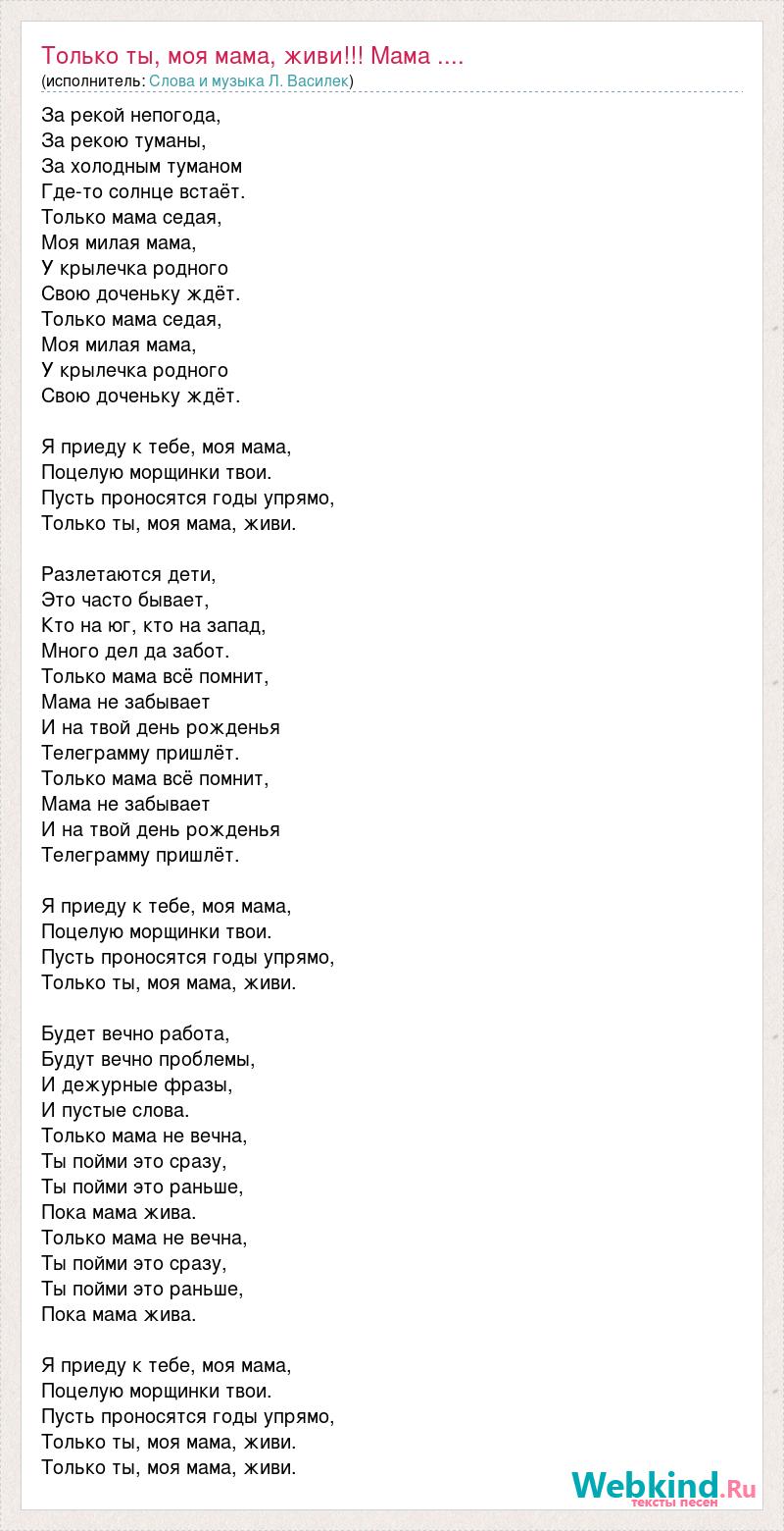 За рекой непогода, За рекою туманы, За холодным туманом Где-то солнце встаёт. Только мама седая, Моя милая мама, У крылечка родного Свою доченьку ждёт. Только мама седая, Моя милая мама, У крылечка родного Свою доченьку ждёт. Я приеду к тебе, моя мама, Поцелую морщинки твои. Пусть проносятся годы упрямо, Только ты, моя мама, живи. Разлетаются дети, Это часто бывает, Кто на юг, кто на запад, Много дел да забот. Только мама всё помнит, Мама не забывает И на твой день рожденья Телеграмму пришлёт. Только мама всё помнит, Мама не забывает И на твой день рожденья Телеграмму пришлёт. Я приеду к тебе, моя мама, Поцелую морщинки твои. Пусть проносятся годы упрямо, Только ты, моя мама, живи. Будет вечно работа, Будут вечно проблемы, И дежурные фразы, И пустые слова. Только мама не вечна, Ты пойми это сразу, Ты пойми это раньше, Пока мама жива. Только мама не вечна, Ты пойми это сразу, Ты пойми это раньше, Пока мама жива. Я приеду к тебе, моя мама, Поцелую морщинки твои. Пусть проносятся годы упрямо, Только ты, моя мама, живи. Только ты, моя мама, живи.
