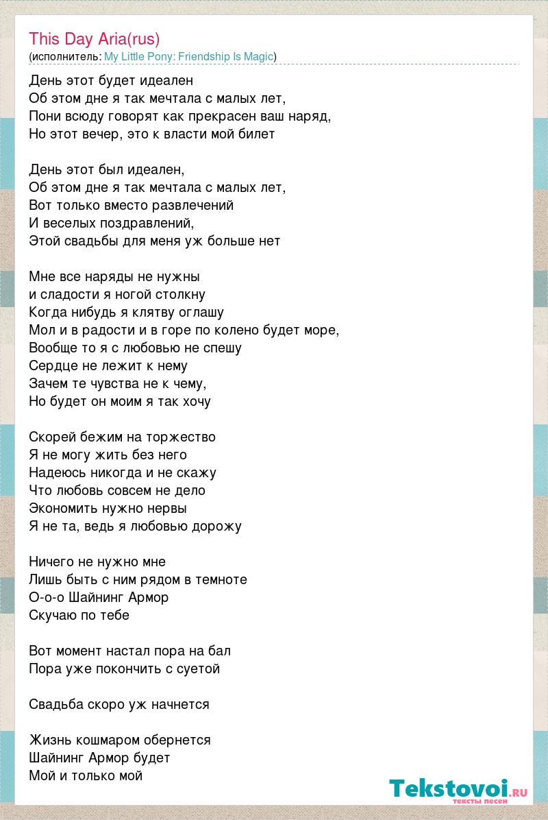 День этот будет идеален Об этом дне я так мечтала с малых лет, Пони всюду говорят как прекрасен ваш наряд, Но этот вечер, это к власти мой билет День этот был идеален, Об этом дне я так мечтала с малых лет, Вот только вместо развлечений И веселых поздравлений, Этой свадьбы для меня уж больше нет Мне все наряды не нужны и сладости я ногой столкну Когда нибудь я клятву оглашу Мол и в радости и в горе по колено будет море, Вообще то я с любовью не спешу Сердце не лежит к нему Зачем те чувства не к чему, Но будет он моим я так хочу Скорей бежим на торжество Я не могу жить без него Надеюсь никогда и не скажу Что любовь совсем не дело Экономить нужно нервы Я не та, ведь я любовью дорожу Ничего не нужно мне Лишь быть с ним рядом в темноте О-о-о Шайнинг Армор Скучаю по тебе Вот момент настал пора на бал Пора уже покончить с суетой Свадьба скоро уж начнется Жизнь кошмаром обернется Шайнинг Армор будет Мой и только мой
