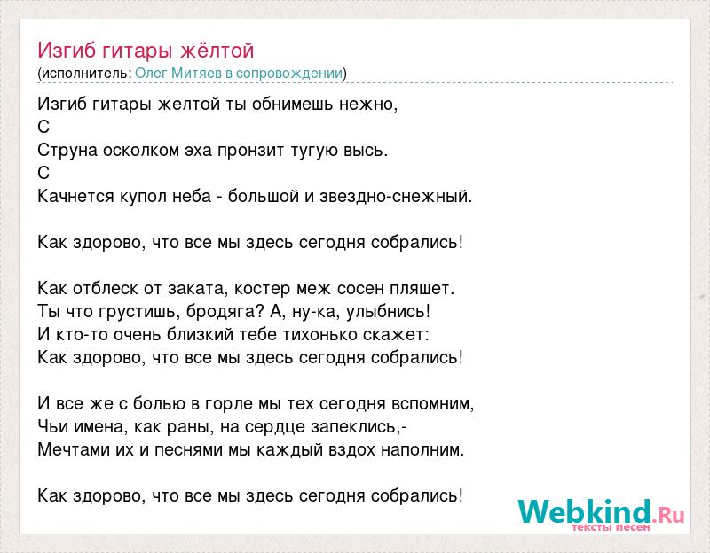 Изгиб гитары желтой ты обнимешь нежно, С Струна осколком эха пронзит тугую высь. С Качнется купол неба - большой и звездно-снежный. Как здорово, что все мы здесь сегодня собрались! Как отблеск от заката, костер меж сосен пляшет. Ты что грустишь, бродяга? А, ну-ка, улыбнись! И кто-то очень близкий тебе тихонько скажет: Как здорово, что все мы здесь сегодня собрались! И все же с болью в горле мы тех сегодня вспомним, Чьи имена, как раны, на сердце запеклись,- Мечтами их и песнями мы каждый вздох наполним. Как здорово, что все мы здесь сегодня собрались!