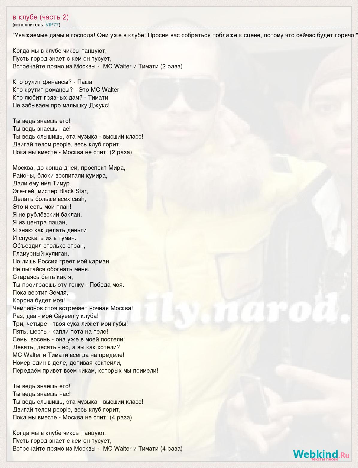 "Уважаемые дамы и господа! Они уже в клубе! Просим вас собраться поближе к сцене, потому что сейчас будет горячо!" Когда мы в клубе чиксы танцуют, Пусть город знает с кем он тусует, Встречайте прямо из Москвы - MC Walter и Тимати (2 раза) Кто рулит финансы? - Паша Кто крутит романсы? - Это MC Walter Кто любит грязных дам? - Тимати Не забываем про малышку Джукс! Ты ведь знаешь его! Ты ведь знаешь нас! Ты ведь слышишь, эта музыка - высший класс! Двигай телом people, весь клуб горит, Пока мы вместе - Москва не спит! (2 раза) Москва, до конца дней, проспект Мира, Районы, блоки воспитали кумира, Дали ему имя Тимур, Эге-гей, мистер Black Star, Делать больше всех cash, Это и есть мой план! Я не рублёвский баклан, Я из центра пацан, Я знаю как делать деньги И спускать их в туман. Объездил столько стран, Гламурный хулиган, Но лишь Россия греет мой карман. Не пытайся обогнать меня. Стараясь быть как я, Ты проиграешь эту гонку - Победа моя. Пока вертит Земля, Корона будет моя! Чемпионов стоя встречает ночная Москва! Раз, два - мой Cayeen у клуба! Три, четыре - твоя сука лижет мои губы! Пять, шесть - капли пота на теле! Семь, восемь - она уже в моей постели! Девять, десять - но, а вы как хотели? MC Walter и Тимати всегда на пределе! Номер один в деле, допивая коктейли, Передаём привет всем чикам, которых мы поимели! Ты ведь знаешь его! Ты ведь знаешь нас! Ты ведь слышишь, эта музыка - высший класс! Двигай телом people, весь клуб горит, Пока мы вместе - Москва не спит! (4 раза) Когда мы в клубе чиксы танцуют, Пусть город знает с кем он тусует, Встречайте прямо из Москвы - MC Walter и Тимати (4 раза)