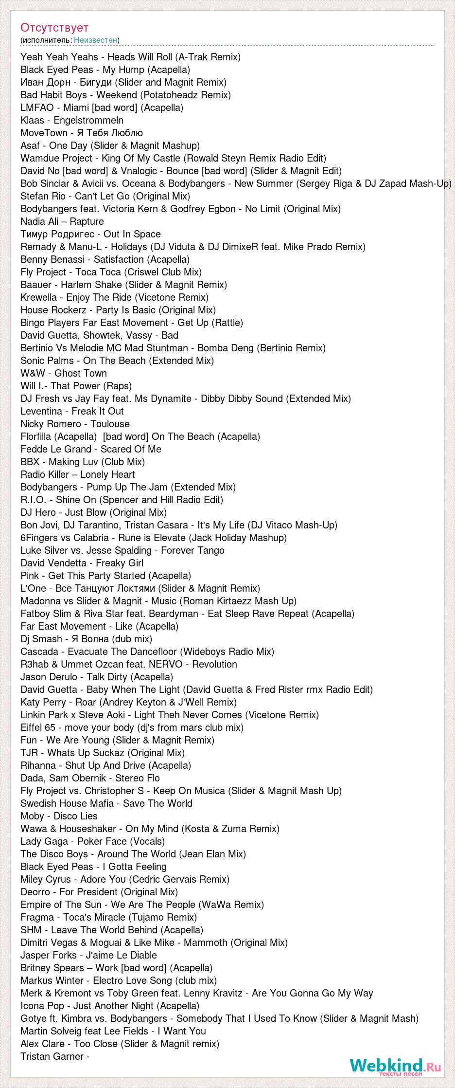 Yeah Yeah Yeahs - Heads Will Roll (A-Trak Remix) Black Eyed Peas - My Hump (Acapella) Иван Дорн - Бигуди (Slider and Magnit Remix) Bad Habit Boys - Weekend (Potatoheadz Remix) LMFAO - Miami [bad word] (Acapella) Klaas - Engelstrommeln MoveTown - Я Тебя Люблю Asaf - One Day (Slider & Magnit Mashup) Wamdue Project - King Of My Castle (Rowald Steyn Remix Radio Edit) David No [bad word] & Vnalogic - Bounce [bad word] (Slider & Magnit Edit) Bob Sinclar & Avicii vs. Oceana & Bodybangers - New Summer (Sergey Riga & DJ Zapad Mash-Up) Stefan Rio - Can't Let Go (Original Mix) Bodybangers feat. Victoria Kern & Godfrey Egbon - No Limit (Original Mix) Nadia Ali – Rapture Тимур Родригес - Out In Space Remady & Manu-L - Holidays (DJ Viduta & DJ DimixeR feat. Mike Prado Remix) Benny Benassi - Satisfaction (Acapella) Fly Project - Toca Toca (Criswel Club Mix) Baauer - Harlem Shake (Slider & Magnit Remix) Krewella - Enjoy The Ride (Vicetone Remix) House Rockerz - Party Is Basic (Original Mix) Bingo Players Far East Movement - Get Up (Rattle) David Guetta, Showtek, Vassy - Bad Bertinio Vs Melodie MC Mad Stuntman - Bomba Deng (Bertinio Remix) Sonic Palms - On The Beach (Extended Mix) W&W - Ghost Town Will I.- That Power (Raps) DJ Fresh vs Jay Fay feat. Ms Dynamite - Dibby Dibby Sound (Extended Mix) Leventina - Freak It Out Nicky Romero - Toulouse Florfilla (Acapella) [bad word] On The Beach (Acapella) Fedde Le Grand - Scared Of Me BBX - Making Luv (Club Mix) Radio Killer – Lonely Heart Bodybangers - Pump Up The Jam (Extended Mix) R.I.O. - Shine On (Spencer and Hill Radio Edit) DJ Hero - Just Blow (Original Mix) Bon Jovi, DJ Tarantino, Tristan Casara - It's My Life (DJ Vitaco Mash-Up) 6Fingers vs Calabria - Rune is Elevate (Jack Holiday Mashup) Luke Silver vs. Jesse Spalding - Forever Tango David Vendetta - Freaky Girl Pink - Get This Party Started (Acapella) L'One - Все Танцуют Локтями (Slider & Magnit Remix) Madonna vs Slider & Magnit - Music (Roman Kirtaezz Mash Up) Fatboy Slim & Riva Star feat. Beardyman - Eat Sleep Rave Repeat (Acapella) Far East Movement - Like (Acapella) Dj Smash - Я Волна (dub mix) Cascada - Evacuate The Dancefloor (Wideboys Radio Mix) R3hab & Ummet Ozcan feat. NERVO - Revolution Jason Derulo - Talk Dirty (Acapella) David Guetta - Baby When The Light (David Guetta & Fred Rister rmx Radio Edit) Katy Perry - Roar (Andrey Keyton & J'Well Remix) Linkin Park x Steve Aoki - Light Theh Never Comes (Vicetone Remix) Eiffel 65 - move your body (dj's from mars club mix) Fun - We Are Young (Slider & Magnit Remix) TJR - Whats Up Suckaz (Original Mix) Rihanna - Shut Up And Drive (Acapella) Dada, Sam Obernik - Stereo Flo Fly Project vs. Christopher S - Keep On Musica (Slider & Magnit Mash Up) Swedish House Mafia - Save The World Moby - Disco Lies Wawa & Houseshaker - On My Mind (Kosta & Zuma Remix) Lady Gaga - Poker Face (Vocals) The Disco Boys - Around The World (Jean Elan Mix) Black Eyed Peas - I Gotta Feeling Miley Cyrus - Adore You (Cedric Gervais Remix) Deorro - For President (Original Mix) Empire of The Sun - We Are The People (WaWa Remix) Fragma - Toca's Miracle (Tujamo Remix) SHM - Leave The World Behind (Acapella) Dimitri Vegas & Moguai & Like Mike - Mammoth (Original Mix) Jasper Forks - J'aime Le Diable Britney Spears – Work [bad word] (Acapella) Markus Winter - Electro Love Song (club mix) Merk & Kremont vs Toby Green feat. Lenny Kravitz - Are You Gonna Go My Way Icona Pop - Just Another Night (Acapella) Gotye ft. Kimbra vs. Bodybangers - Somebody That I Used To Know (Slider & Magnit Mash) Martin Solveig feat Lee Fields - I Want You Alex Clare - Too Close (Slider & Magnit remix) Tristan Garner -